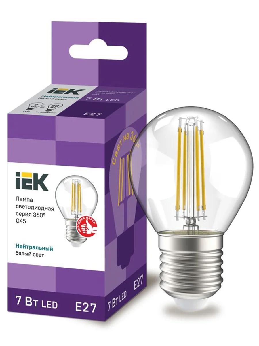 Лампа LED G45 шар прозр. 7Вт 230В 4000К E27 серия 360° IEK с нитевидным светодиодом (филаментная нить) является одним из самых эффективных источников света. Главное отличие от обычных светодиодных ламп – угол рассеивания света до 360° (дополнительный комфорт для глаз). Лампа применяется в осветительных приборах бытового назначения. Представлены в 3 вариантах: с прозрачной, золоченой и матовой колбами. Соответствуют требованиям Технических регламентов Таможенного союза ТР ТС 004/2011, ТР ТС 020/2011, МЭК 62560 и постановления Правительства РФ от 10.11.2017 № 1356.