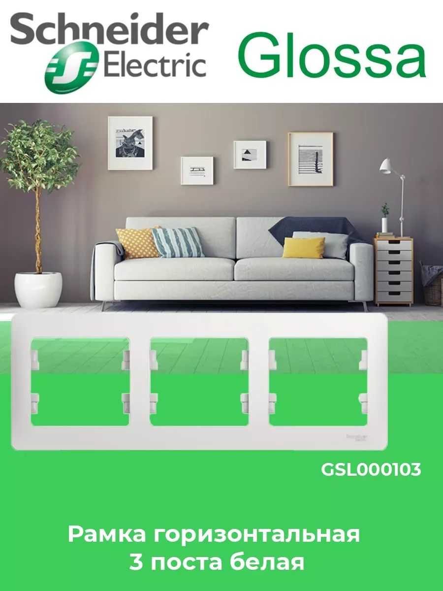 Рамка Systeme Electric (ранее Schneider Electric) серии Glossa (цвет белый) тройная. Выполнена из материала PС+ASA, стойкого к УФ-излучению и появлению царапин. Позволяет гармонично вписать электроустановочное изделие в интерьер помещения.
