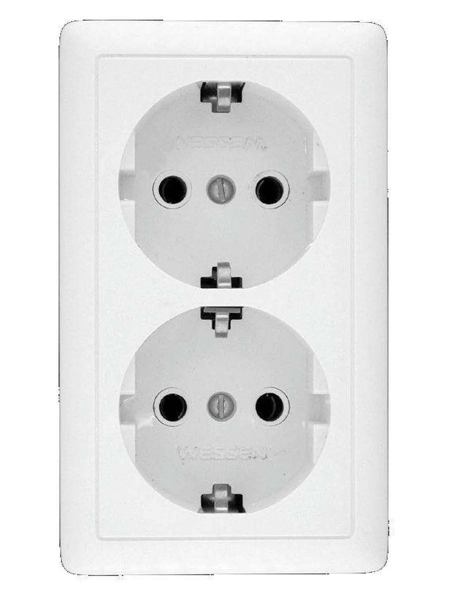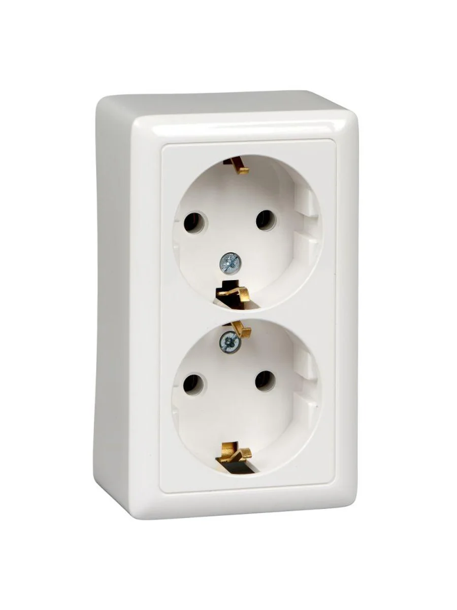 Розетка Systeme Electric (ранее Schneider Electric) ХИТ (открытой установки, цвет белый) двойная с заземлением, без шторок предназначена для сетей до 250 В на ток до 16 А. Двойная розетка позволяет подключить два устройства в одном месте. Заземляющий контакт обеспечивает дополнительную защиту от удара электрическим током. При наличии заземления электрический потенциал уходит в землю, защищая человека. Сделано в России.