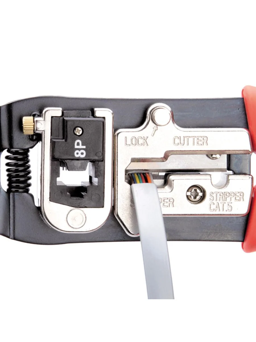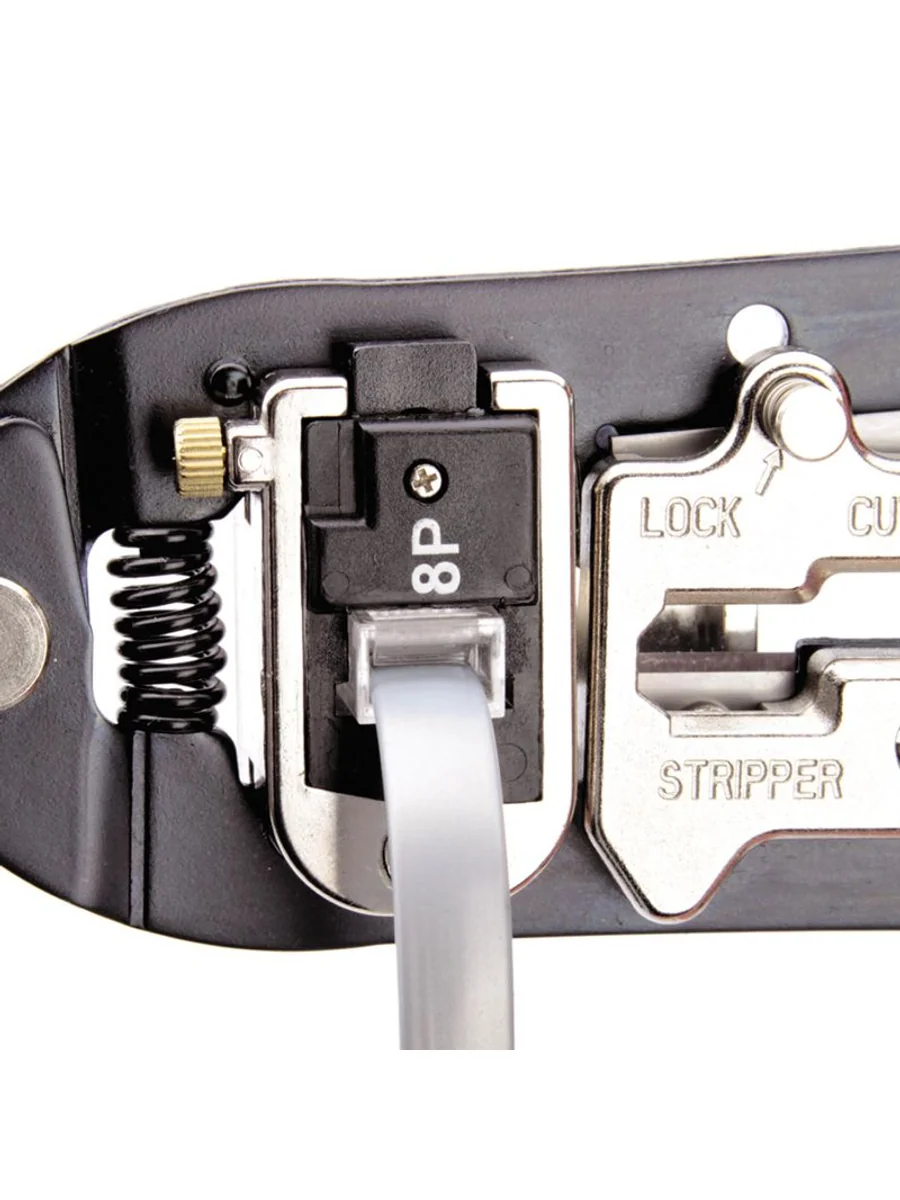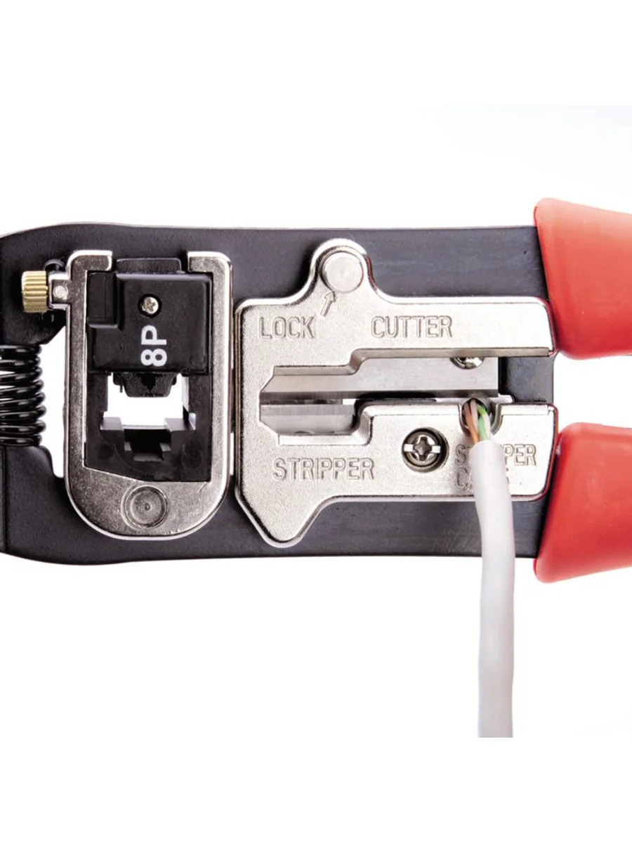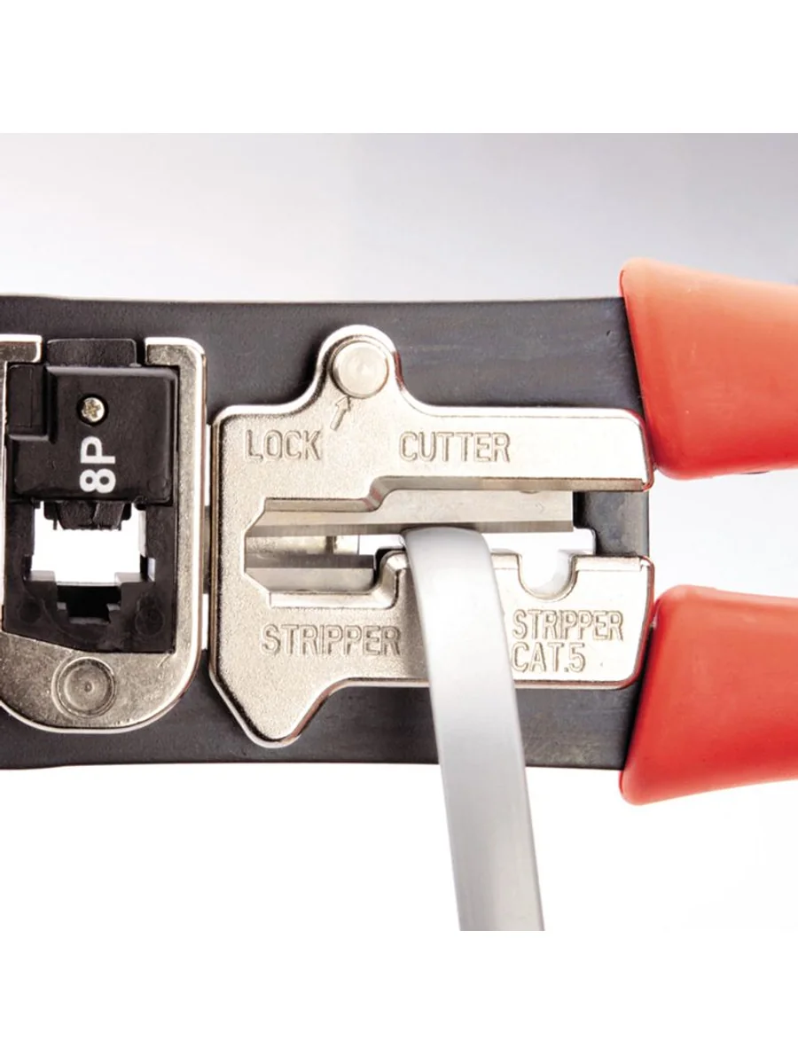 • 4 в 1: • обжим разъемов RJ • снятие изоляции с плоских телефонных проводов с фиксированной длиной зачистки, • снятие оболочки с круглых проводов типа UTP, STP • резка проводов • Обжим разъемов 8Р8С (RJ-45) • Эргономичные рукоятки из нескользящей термопластрезины • Блокиратор рукояток обеспечивает удобство хранения и переноски • Возвратная пружина улучшает эргономику и позволяет работать одной рукой • Металлическая защитная панель, предохраняющая от порезов • Обработка поверхности: воронение/хромирование • Вес: 320 г • Длина: 200 мм