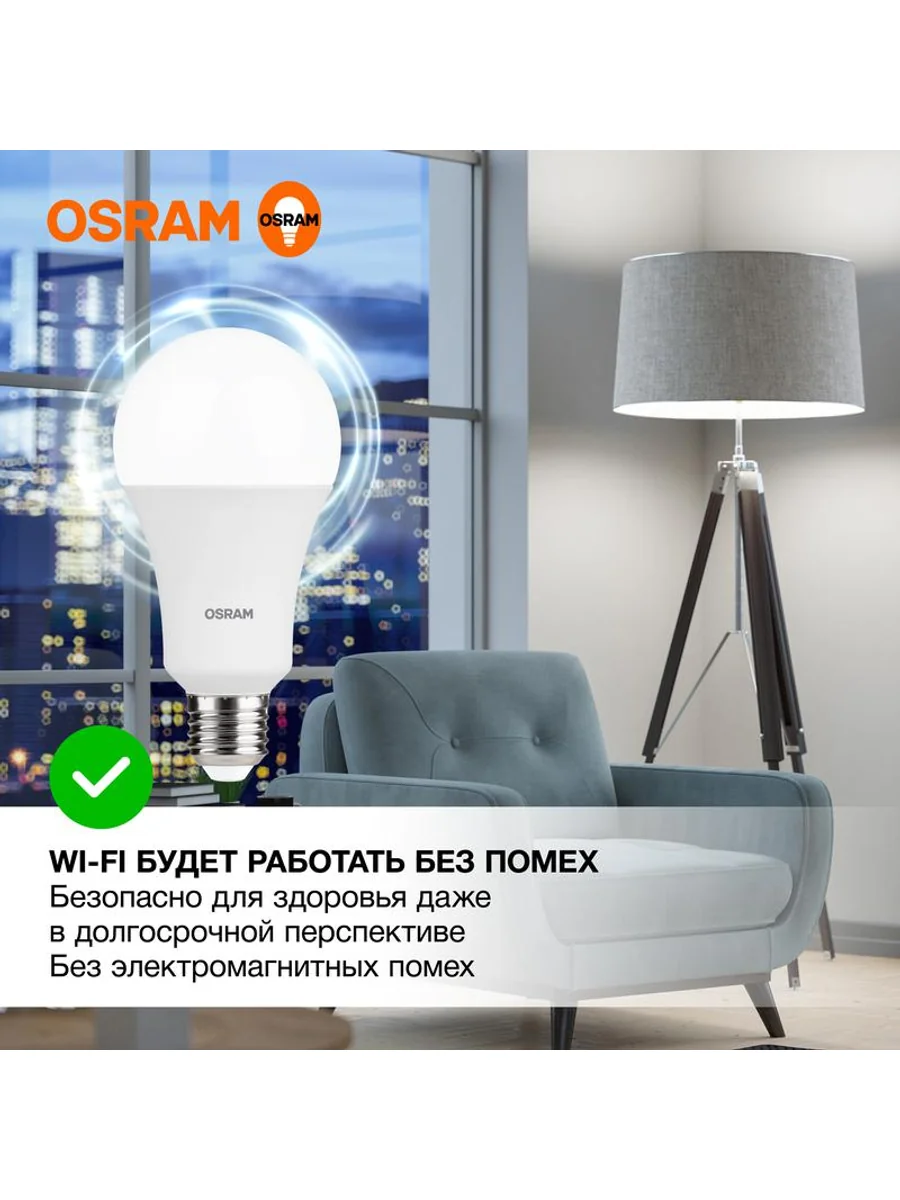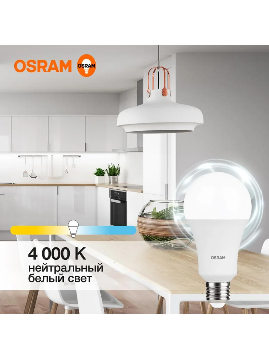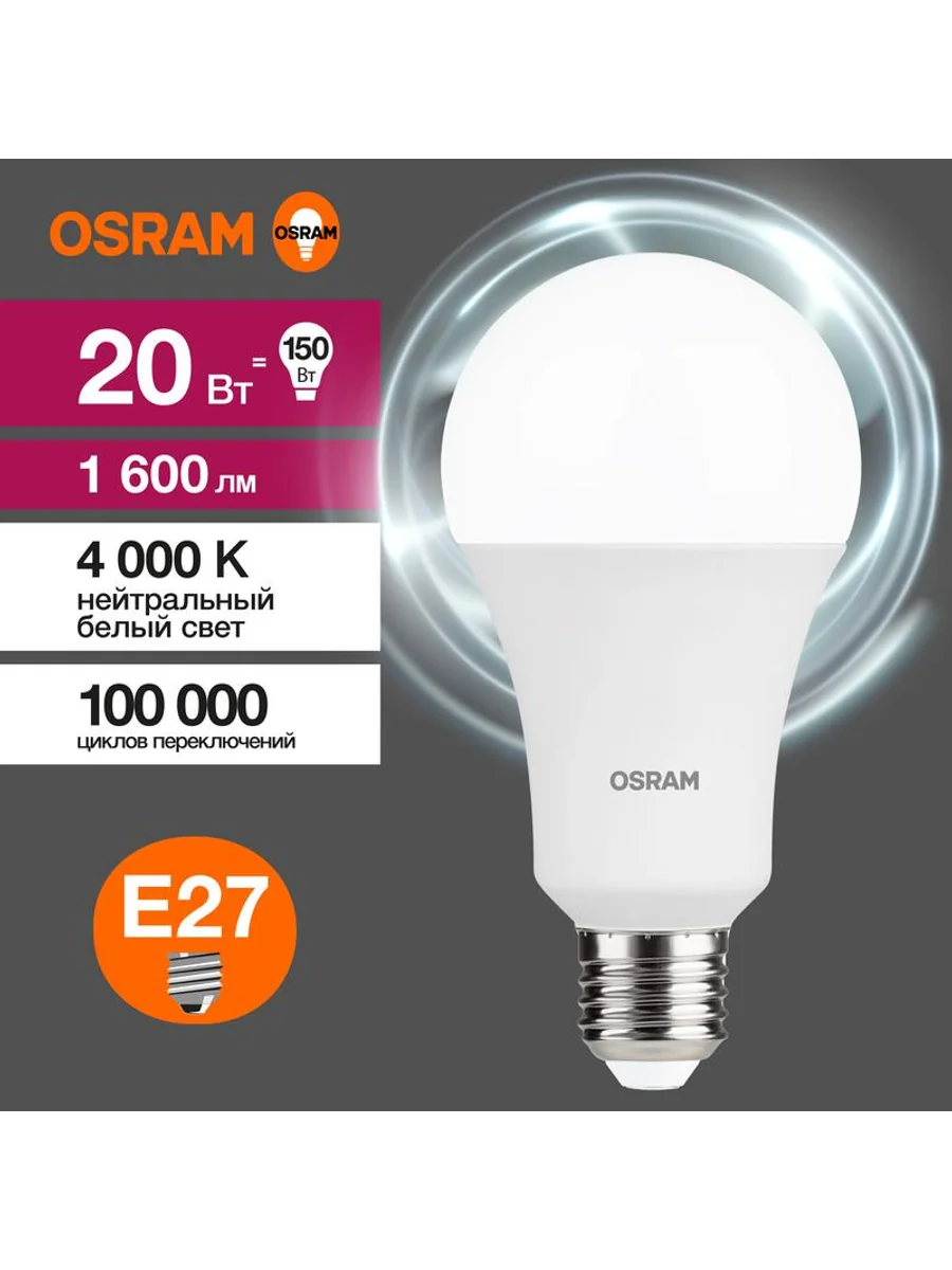 Светодиодные лампы OSRAM - разумная замена традиционным лампам накаливания или галогенным лампам. Светодиодные лампы OSRAM снижают затраты на освещение до 90% при сохранении привычного уровня освещенности. Эта лампа OSRAM серии LED Value выполнена в форме колбы A ("груша") с цоколем E27. Материал колбы - пластик, исполнение - матовое. Световой поток 1600 люмен, что соответствует лампе накаливания на 150 Вт. Такие лампы применяются для внутреннего освещения, хотя в закрытом светильнике можно использовать и на улице. Эта лампа излучает нейтральный белый свет, угол пучка - широкий. Качество света на высоте: низкие пульсации защищают глаза, а высокий индекс цветопередачи позволяет видеть мир в его истинном цвете. Кроме того, лампы OSRAM полностью безопасны для здоровья, поскольку в них нет опасных материалов по европейскому стандарту RoHS, а также они не производят вредных электромагнитных излучений, что подтверждено ЭМС (сертификат электромагнитной совместимости). Лампа проработает долго: срок службы - 25000 часов, 2 года гарантии. Светодиодные лампы OSRAM - умный выбор для здоровья семьи и кошелька!