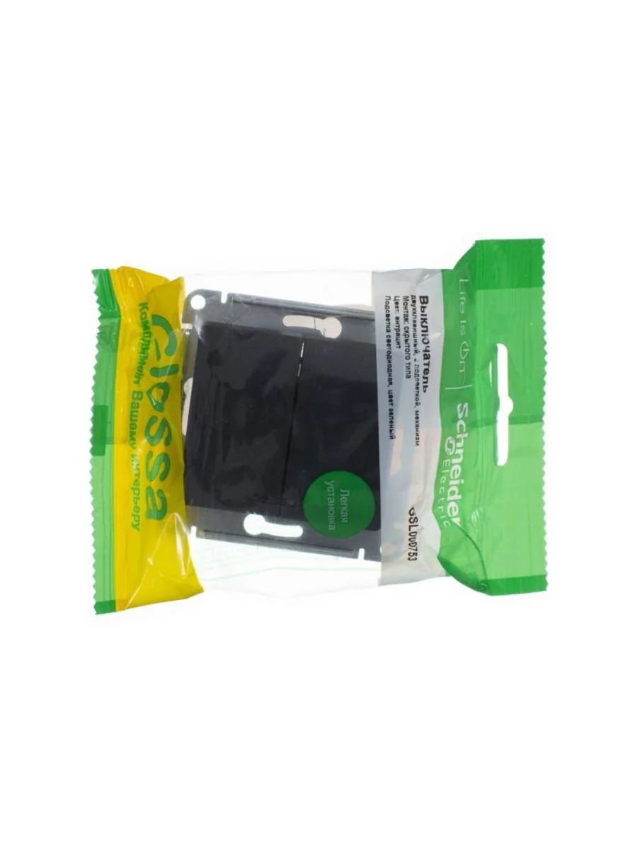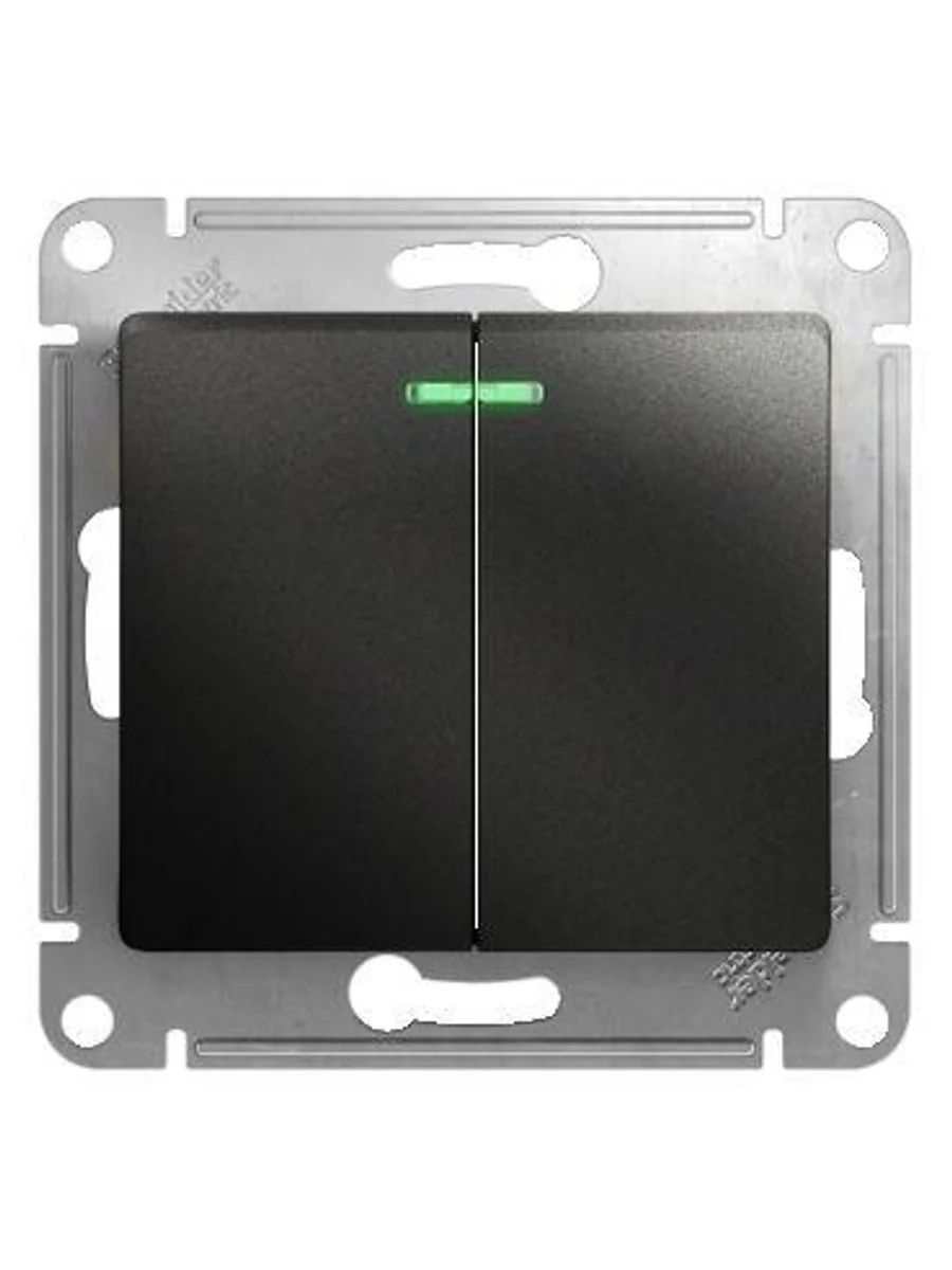Механизм Systeme Electric серии Glossa (цвет антрацит) выключателя 2-клавишного c подсветкой подходит для сетей 250 В, на ток 10 А. - Благодаря современной светодиодной подсветке зеленого цвета изделие легко найти в темноте. - Двухклавишный выключатель позволяет управлять двумя источниками света с одной точки. - Выполнен из материала PС+ASA, стойкого к УФ-излучению и появлению царапин. - Эргономичные клеммы расположены в два ряда: сверху и снизу (ранее Schneider Electric NU521154N).