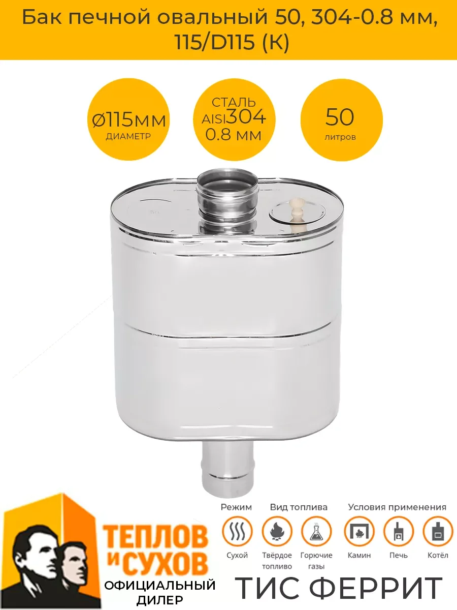 Бак печной 50, натрубный, предназначен для нагрева воды в банном помещении. Является частью дымоходной системы. В нижней части бак оборудован патрубком 3/4 для слива воды.