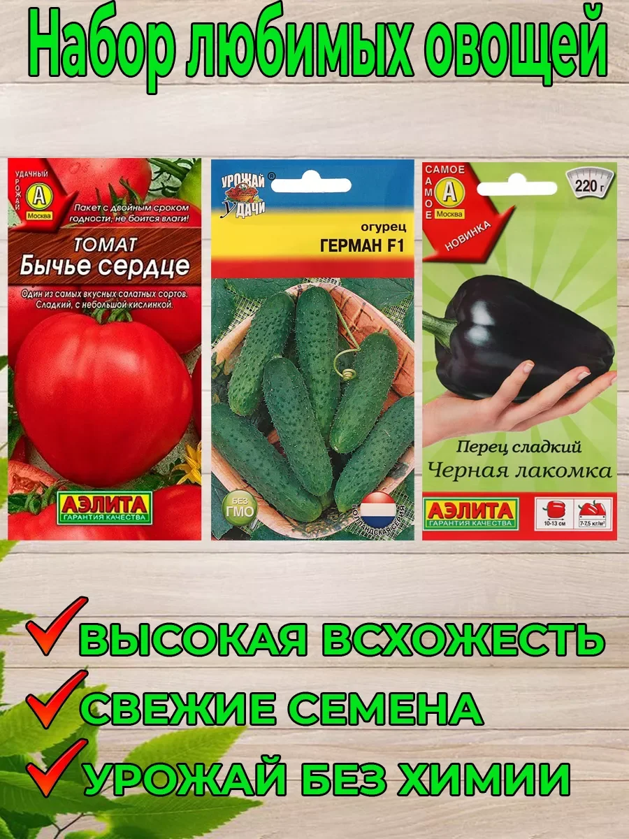 Набор семян состоит из трех пачек. Томат "Бычье Сердце" Аэлита, Огурец "Герман" Урожай Удачи, Перец сладкий "Черная Лакомка" Аэлита. Они содержат ранне- и среднеспелые сорта, которые без проблем растут как в домашних условиях, так и на открытой почве средней полосы России. Никаких сложных техник и особенных требований. Вы хотите создать собственный огород и быть уверенными в экологической чистоте продуктов? Это идеальный способ обеспечить себя и свежими продуктами. Но как сделать правильный выбор среди множества семенных наборов на рынке? Мы предлагаем вам экономное решение - наше ассорти. Выращивание овощей станет легким и успешным процессом. Мы тщательно отбираем самые лучшие сорта и использование системы покрытия для сохранения их всхожести. Подходит для огорода и дачи. Мы предлагаем естественный уход без использования химических удобрений и пестицидов. Воспользуйтесь проростками, которые позволят вашим растениям расти полными сил. Не упускайте возможность вырастить ароматные корнеплоды прямо на своей земле. Подойдет для посадки в теплице и на открытом грунте. Не откладывайте на потом - приобретите наш набор семян и приступайте к посадке. Закажите его прямо сейчас и убедитесь в отличном качестве! Подробные описания по уходу Вы найдете в карусели картинок. Богатого Вам урожая!