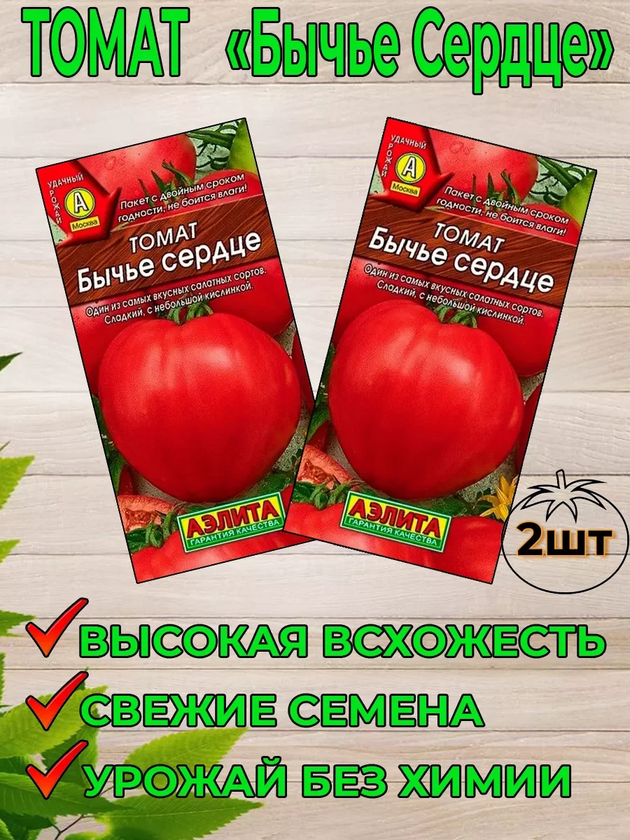 Набор семян состоит из двух пачек томат "Бычье Сердце" Аэлита. Популярный сорт для открытого грунта и пленочных теплиц. Салатный, один из самых вкусных. Вступает в плодоношение на 112-120 день от всходов. Формирует растения высотой 150-170 см. Плоды массой 110-250 г (первые – до 400 г), мясистые, с тонкой кожицей. Вкус классический “помидорный” – сладкий, с чуть заметной кислинкой. Урожайность в о/г 4 кг/м2, под пленкой 10-12 кг/м2.