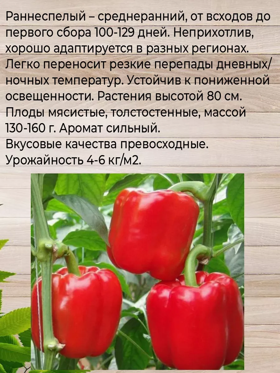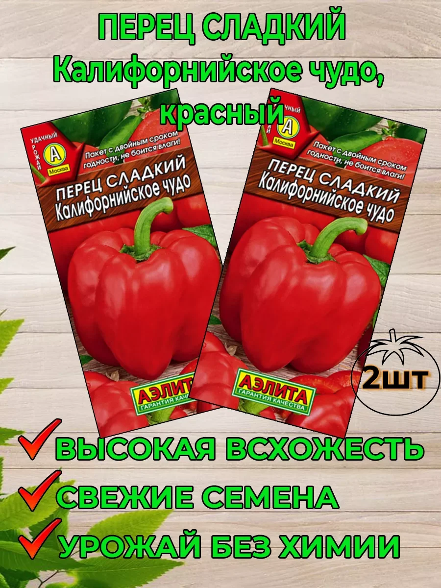 Набор семян состоит из двух пачек перец "Калифорнийское чудо" Аэлита. Сорт хорошо адаптирован к разным климатическим условиям нашей страны. Дает хорошие урожаи в условиях, далеких от идеальных: хорошо переносит перепады температуры, устойчив к пониженной освещенности. Раннеспелый– среднеранний, от всходов до плодоношения 100-129 дней. Растения высотой 80 см, мощные, хорошо облиственные.