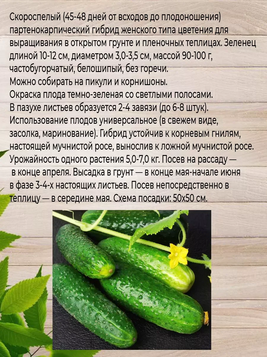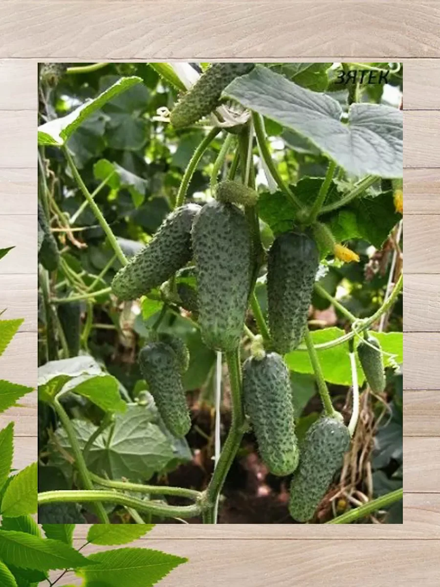 Набор семян состоит из двух пачек. Огурец Зятек: Скороспелый (45-48 дней) партенокарпический гибрид. Зеленец частобугорчатый, белошипый, без горечи, длиной 10-12 см, массой 90-100 г. Окраска плода темно-зеленая со светлыми полосами. В пазухе листьев образуется 2-4 завязи (до 6-8 штук). Имеет мощную корневую систему, интенсивный рост, отдает урожай до конца сентября даже в неблагоприятных условиях, очень вынослив. Ценится за вкусные корнишоны и пикули, пригодные для баночного консервирования.