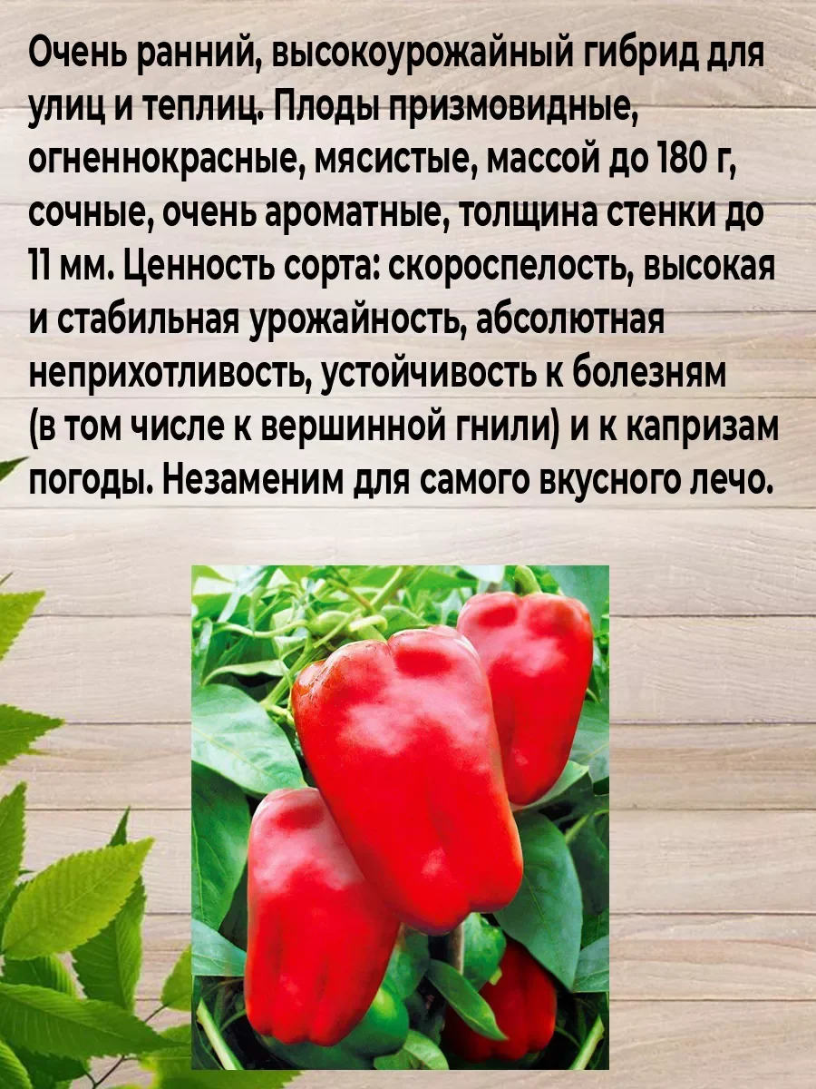 ПЕРЕЦ: Очень ранний, высокоурожайный гибрид для улиц и теплиц. Плоды призмовидные, огненнокрасные, мясистые, массой до 180 г, сочные, очень ароматные, толщина стенки до 11 мм. Ценность сорта: скороспелость, высокая и стабильная урожайность, абсолютная неприхотливость, устойчивость к болезням (в том числе к вершинной гнили) и к капризам погоды. Незаменим для самого вкусного лечо.
