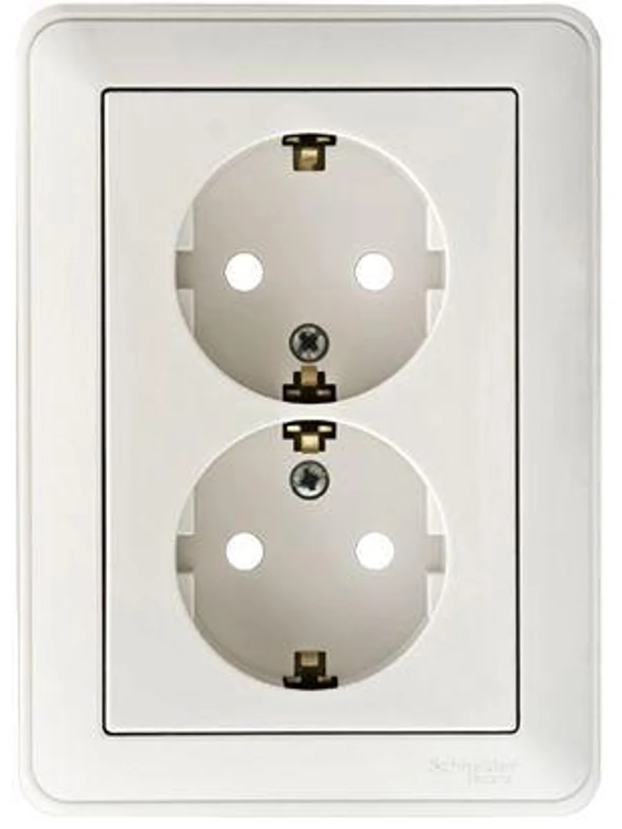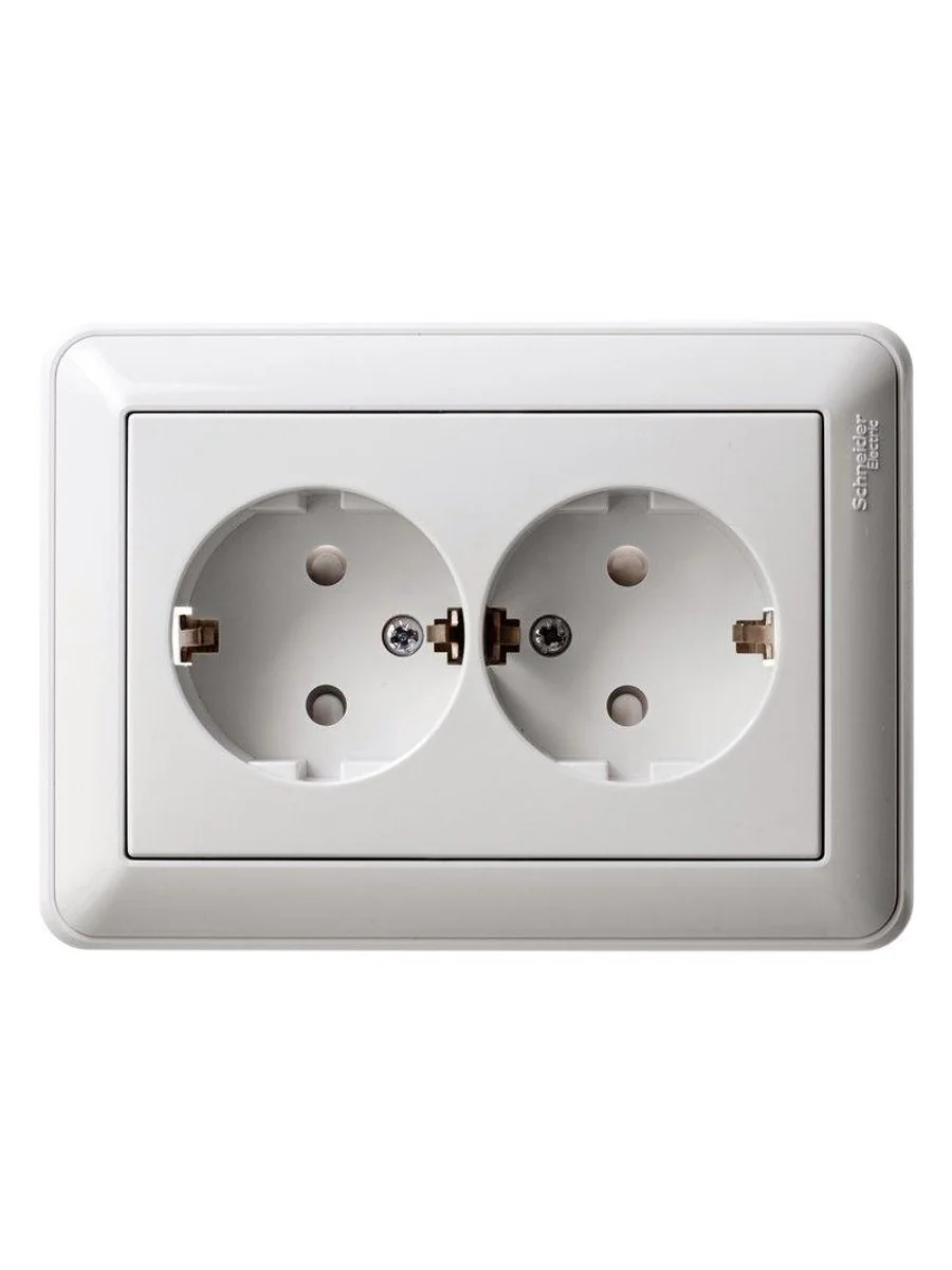 Розетка Systeme Electric (ранее Schneider Electric) W59 (в сборе, цвет белый) двойнаяс заземлением и шторками подходит для сетей 250 В, на ток 16 А. - Заземляющий контакт обеспечивает дополнительную защиту от удара электрическим током. При наличии заземления электрический потенциал уходит в землю, защищая человека. - Шторки обеспечивают дополнительную безопасность в доме, где находятся дети. - Корпус изделия выполнен из высококачественного ABS-пластика.
