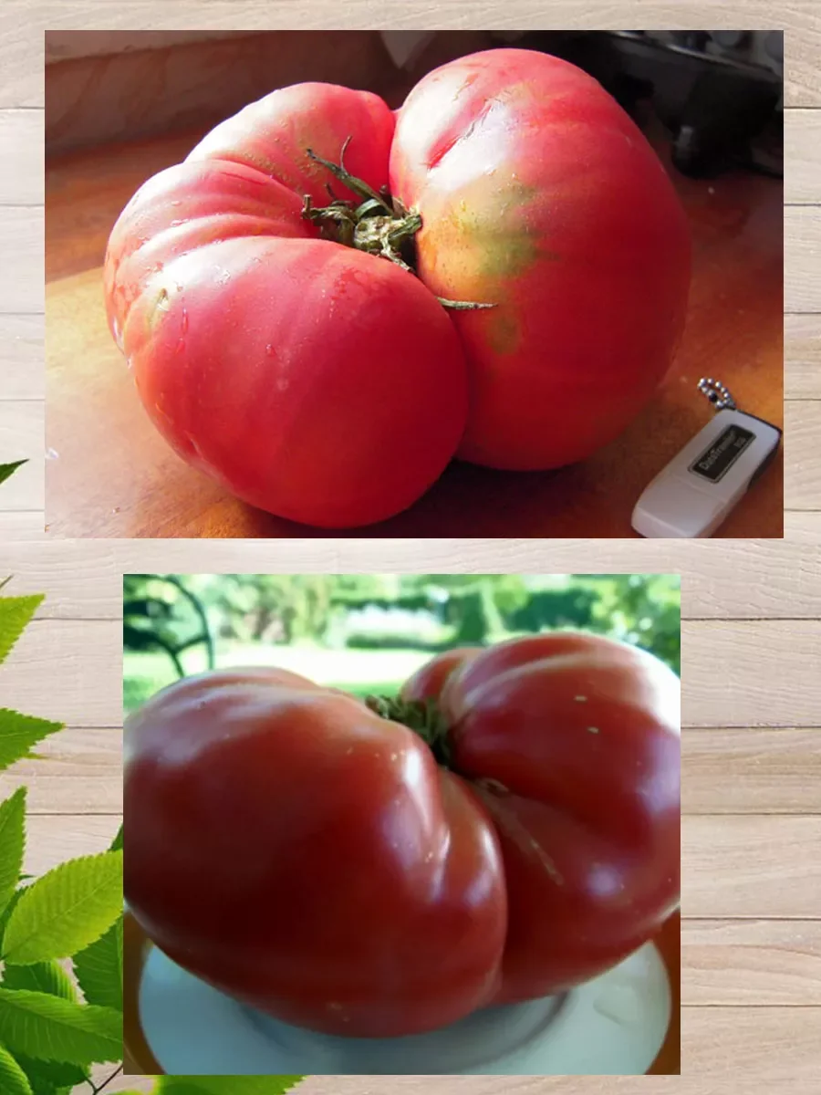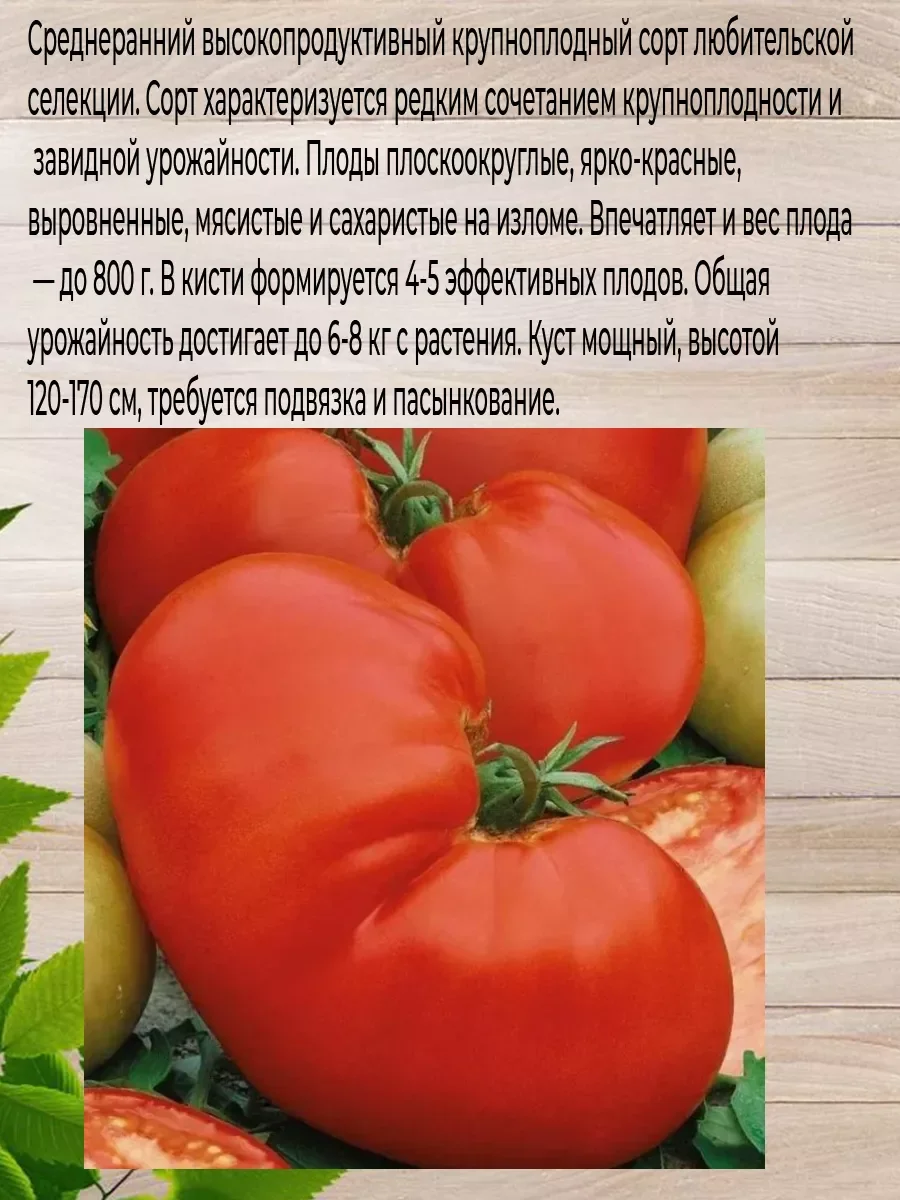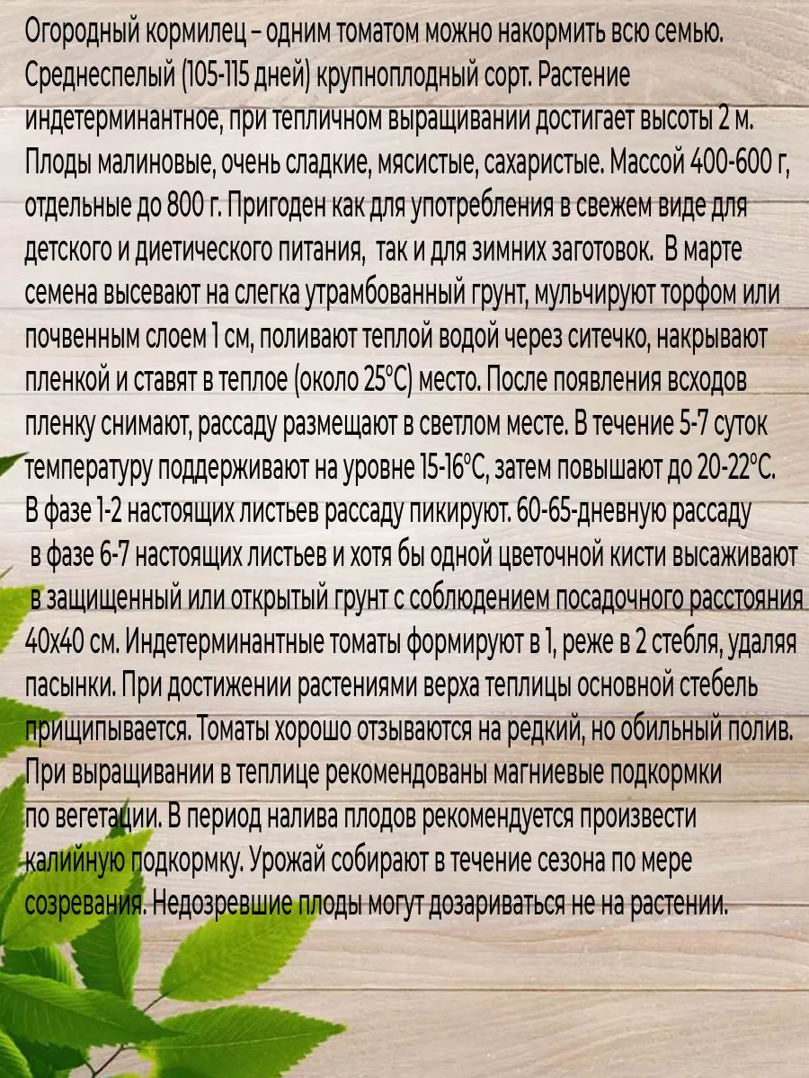 Набор семян состоит из двух пачек. Могучее вымя: Огородный кормилец – одним томатом можно накормить всю семью. Среднеспелый (105-115 дней) крупноплодный сорт. Растение индетерминантное, при тепличном выращивании достигает высоты 2 м. Плоды малиновые, очень сладкие, мясистые, сахаристые. Массой 400-600 г, отдельные до 800 г. Пригоден как для употребления в свежем виде для детского и диетического питания, так и для зимних заготовок. В марте семена высевают на слегка утрамбованный грунт, мульчируют торфом или почвенным слоем 1 см, поливают теплой водой через ситечко, накрывают пленкой и ставят в теплое (около 25°С) место. После появления всходов пленку снимают, рассаду размещают в светлом месте. В течение 5-7 суток температуру поддерживают на уровне 15-16°С, затем повышают до 20-22°С. В фазе 1-2 настоящих листьев рассаду пикируют. 60-65-дневную рассаду в фазе 6-7 настоящих листьев и хотя бы одной цветочной кисти высаживают в защищенный или открытый грунт с соблюдением посадочного расстояния 40х40 см. Индетерминантные томаты формируют в 1, реже в 2 стебля, удаляя пасынки. При достижении растениями верха теплицы основной стебель прищипывается. Томаты хорошо отзываются на редкий, но обильный полив. При выращивании в теплице рекомендованы магниевые подкормки по вегетации. В период налива плодов рекомендуется произвести калийную подкормку. Урожай собирают в течение сезона по мере созревания. Недозревшие плоды могут дозариваться не на растении.