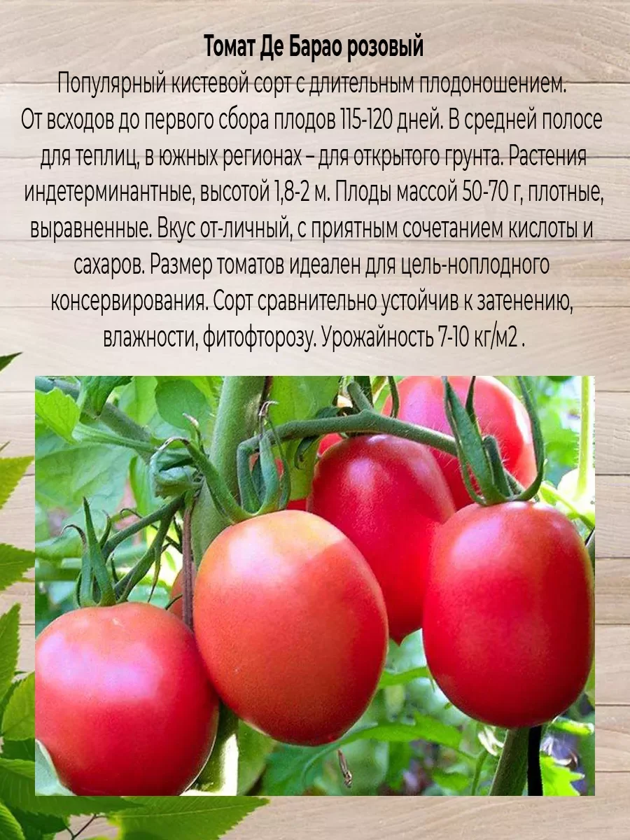 Семена томатов Де Барао агрофирмы АЭЛИТА. Семена томата Де барао - 5 шт. Высокоурожайный холодостойкий и теневыносливый сорт. Надежный источник томатов с августа по октябрь. В средней полосе для теплиц, на юге – для открытого грунта. От всходов до начала сбора 120-125 дней. Растения индетерминантные, высотой около 2 м. Плоды выравненные, плотные, массой 50-80 г; во вкусе сладость преобладает над кислинкой. Идеальны для цельноплодного консервирования. Урожайность 6-8 кг/м2.