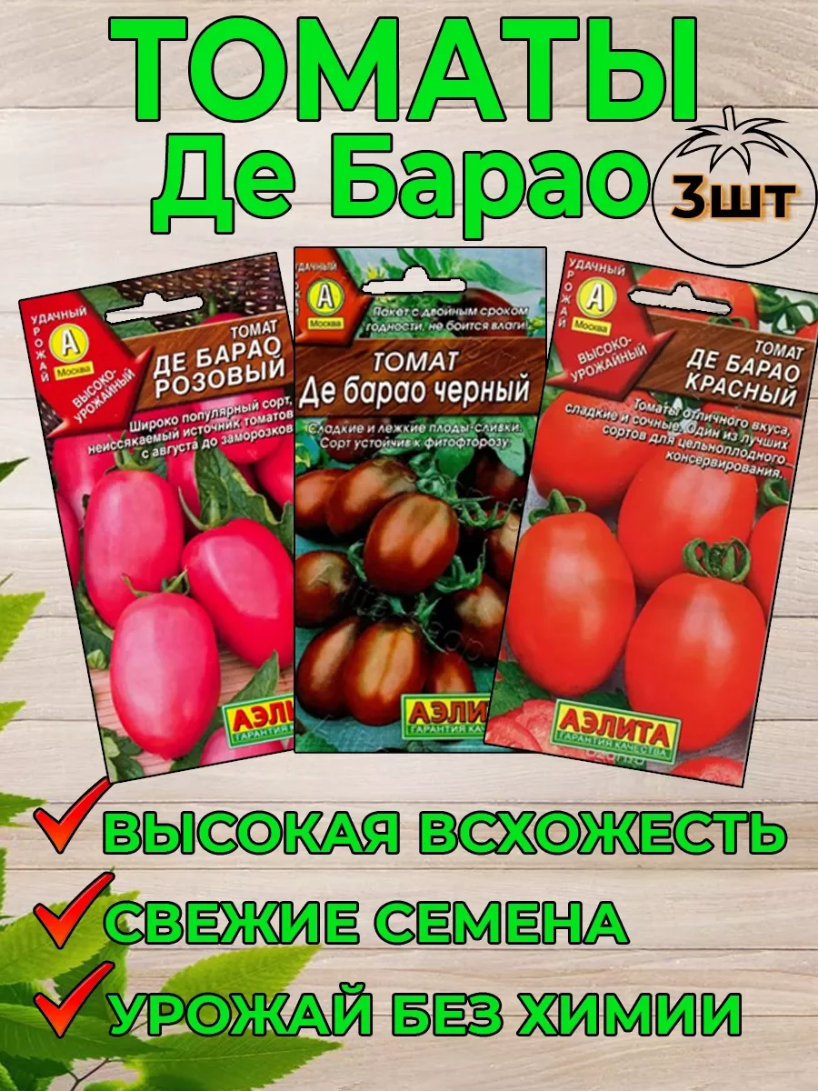 Семена томатов Де Барао агрофирмы АЭЛИТА. Семена томата Де барао - 3 шт. Высокоурожайный холодостойкий и теневыносливый сорт. Надежный источник томатов с августа по октябрь. В средней полосе для теплиц, на юге – для открытого грунта. От всходов до начала сбора 120-125 дней. Растения индетерминантные, высотой около 2 м. Плоды выравненные, плотные, массой 50-80 г; во вкусе сладость преобладает над кислинкой. Идеальны для цельноплодного консервирования. Урожайность 6-8 кг/м2.