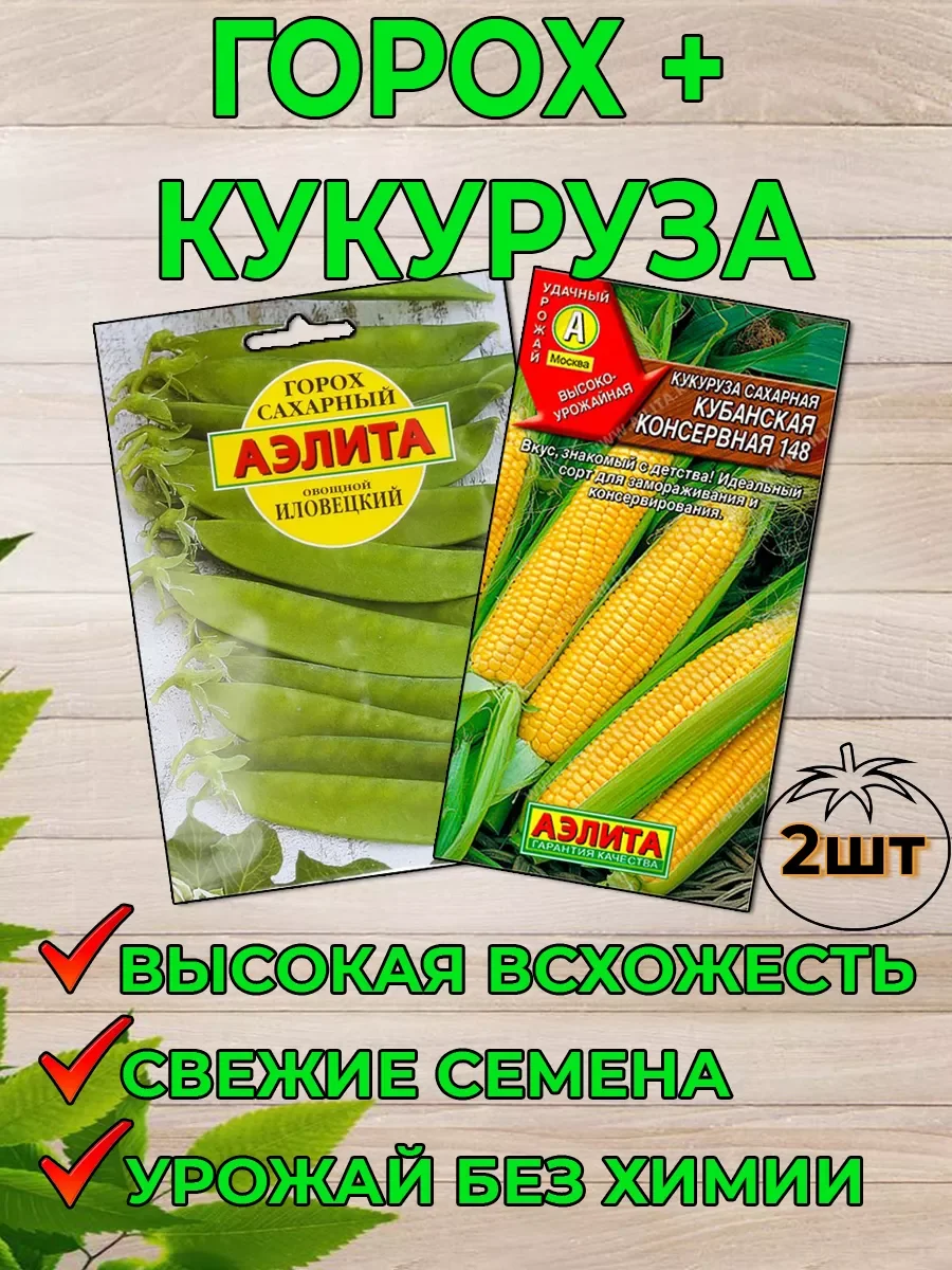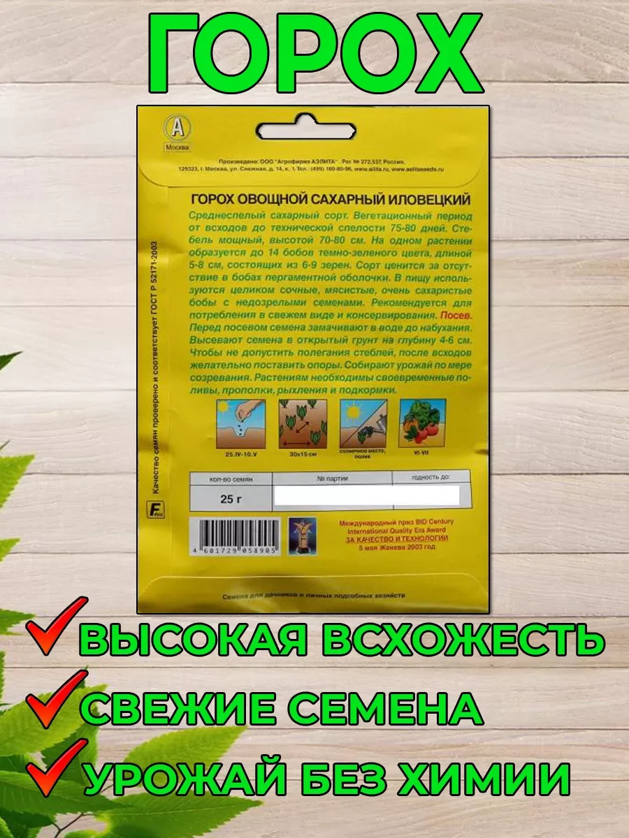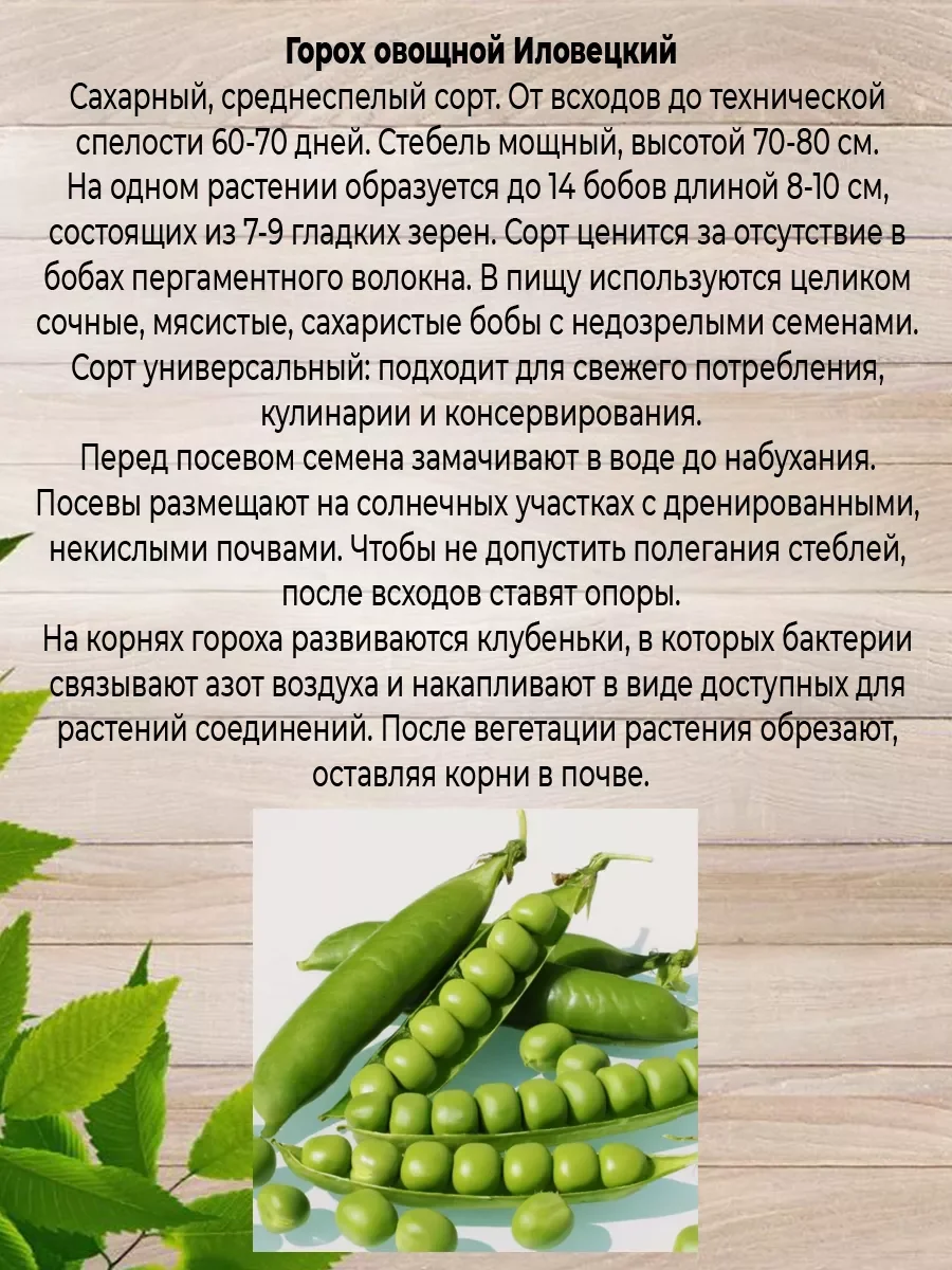 Набор состоит из двух пачек семян. Горох Илловецкий: Сахарный, среднеспелый сорт. От всходов до технической спелости 60-70 дней. Стебель мощный, высотой 70-80 см. На одном растении образуется до 14 бобов длиной 8-10 см, состоящих из 7-9 гладких зерен. Сорт ценится за отсутствие в бобах пергаментного волокна. В пищу используются целиком сочные, мясистые, сахаристые бобы с недозрелыми семенами. Сорт универсальный: подходит для свежего потребления, кулинарии и консервирования.