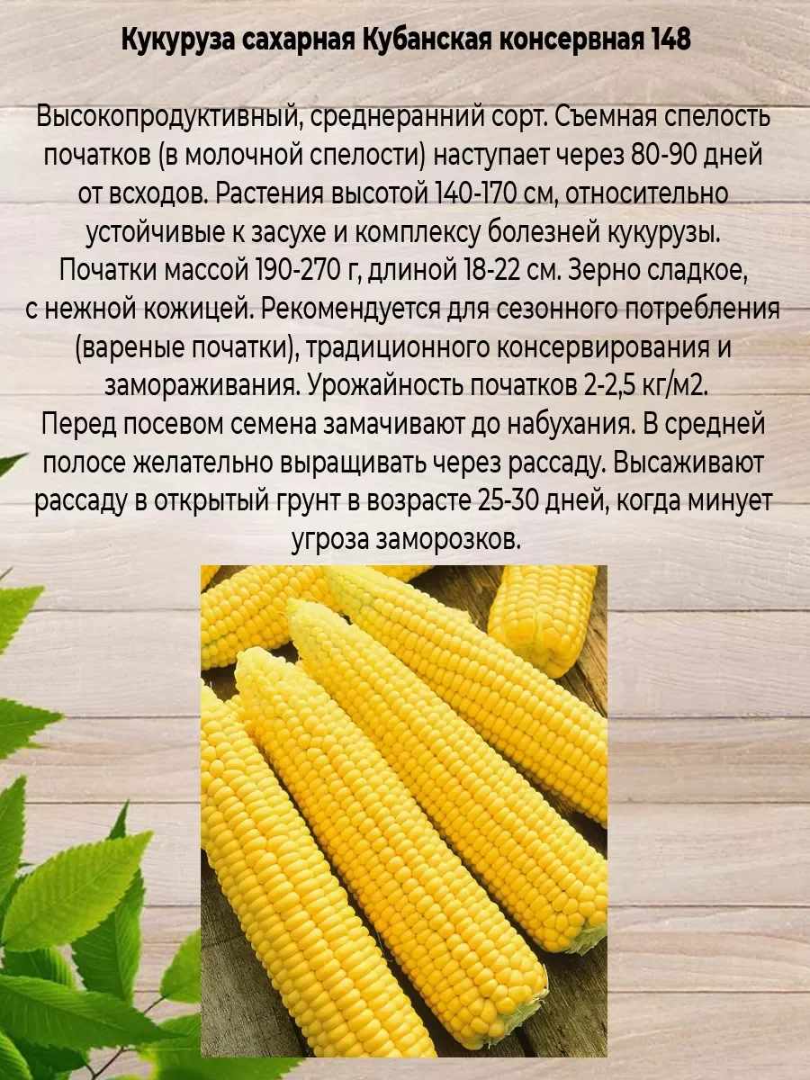 Кукуруза Кубанская: Высокопродуктивный, среднеранний сорт. Съемная спелость початков (в молочной спелости) наступает через 80-90 дней от всходов. Растения высотой 140-170 см, относительно устойчивые к засухе и комплексу болезней кукурузы. Початки массой 190-270 г, длиной 18-22 см. Зерно сладкое, с нежной кожицей. Рекомендуется для сезонного потребления (вареные початки), традиционного консервирования и замораживания. Урожайность початков 2-2,5 кг/м2.