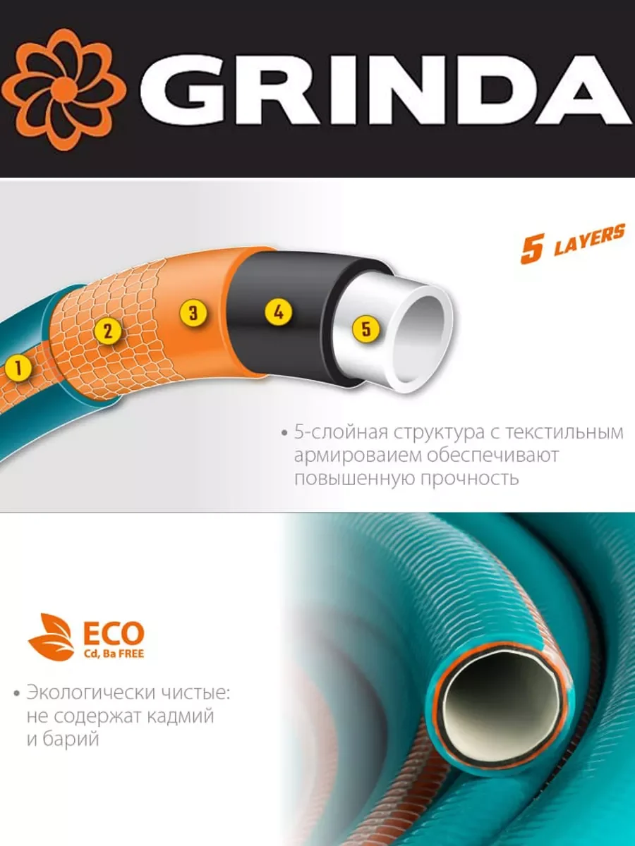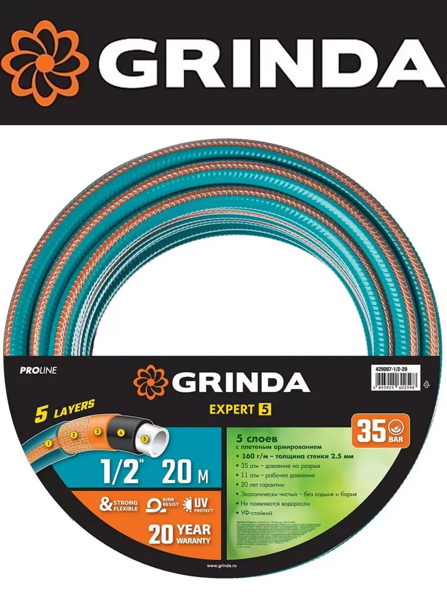 Поливочный шланг садовый пятислойный армированный GRINDA PROLine EXPERT 5 арт. 429007-1/2-20 - профессиональный шланг для поливочных работ на садово-огородном участке, отличающийся особой прочностью и надёжностью. Выполнен из пяти слоёв армированного полиамидными нитями ПВХ, который отличается устойчивостью к воздействию солнца, износостойкостью и не перекручивается при использовании. Сохраняет свою гибкость и эластичность в широчайшем температурном диапазоне. Не содержит кадмий и барий, безопасен для окружающей среды и человека. Внутренняя поверхность исключает возможность возникновения водорослей. Поверхность шланга не восприимчива к ультрафиолетовым лучам. Температурный диапазон хранения и транспортировки -20°С до +50°С, рабочий диапазон от +5°С до +50°С. Разрывное давление 35 атм., рабочее давление 11 атм. Количество слоев - 5. Толщина стенки 2,5 мм. Шланг садовый Гринда качественный и полезный инвентарь на садово-огородный участок. Внимание! Внутренний диаметр шланга равен значению в характеристике карточки товара "Диаметр садового шланга", а также указан в названии. При выборе ориентируйтесь на следующие значения: 1 дюйм = 25 мм, 1/2 дюйм = 12,7 мм, 3/4 дюйма = 19 мм