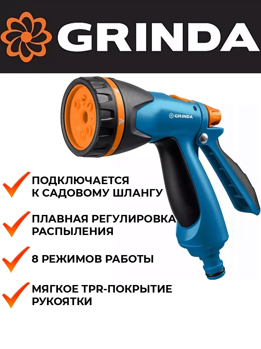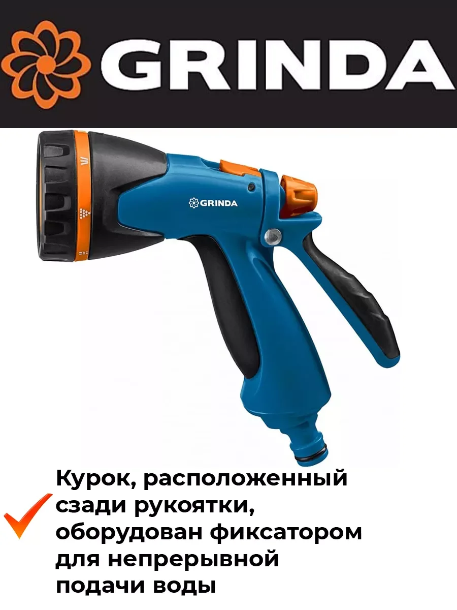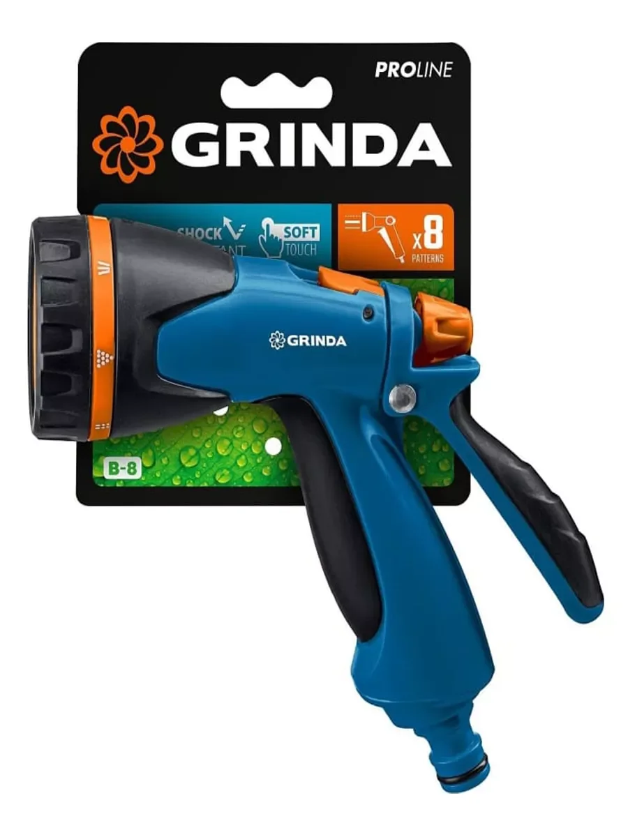 Пистолет поливочный двухкомпонентный PROLine B-8 GRINDA 429110, предназначен для полива растений при подключении к садовому шлангу. 8 режимов работы: мягкая струя, конус, аэрирование, жесткая струя, слабая струя, душ, вертикальный полив, плоская струя-позволят всегда подобрать максимально подходящий именно для ваших целей. Мягкое TPR-покрытие рукоятки гарантирует надёжный и удобный хват. Курок, расположенный сзади рукоятки, оборудован фиксатором для непрерывной подачи воды, что обеспечивает комфорт в эксплуатации пистолета.