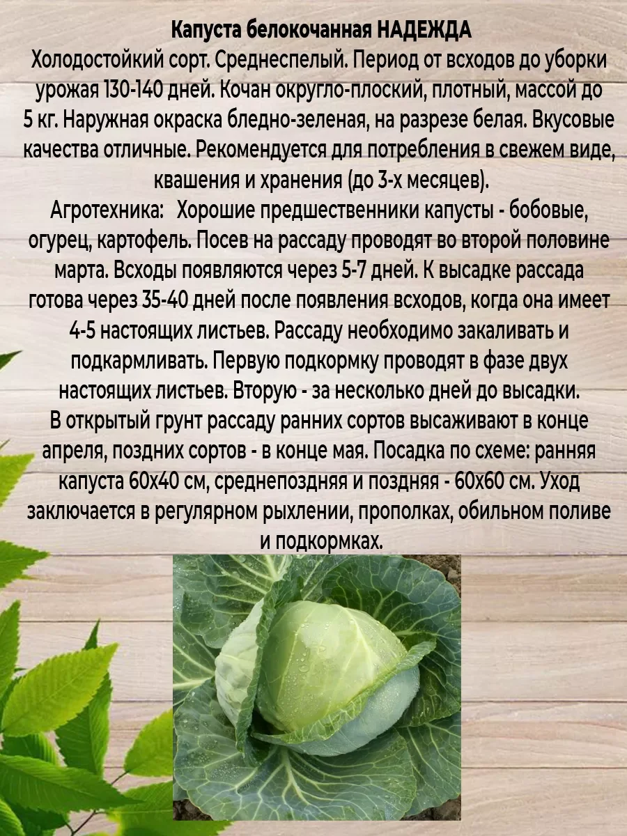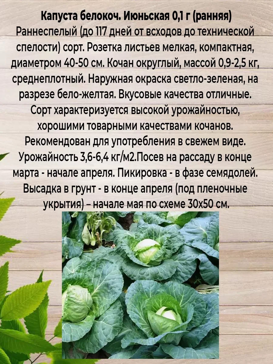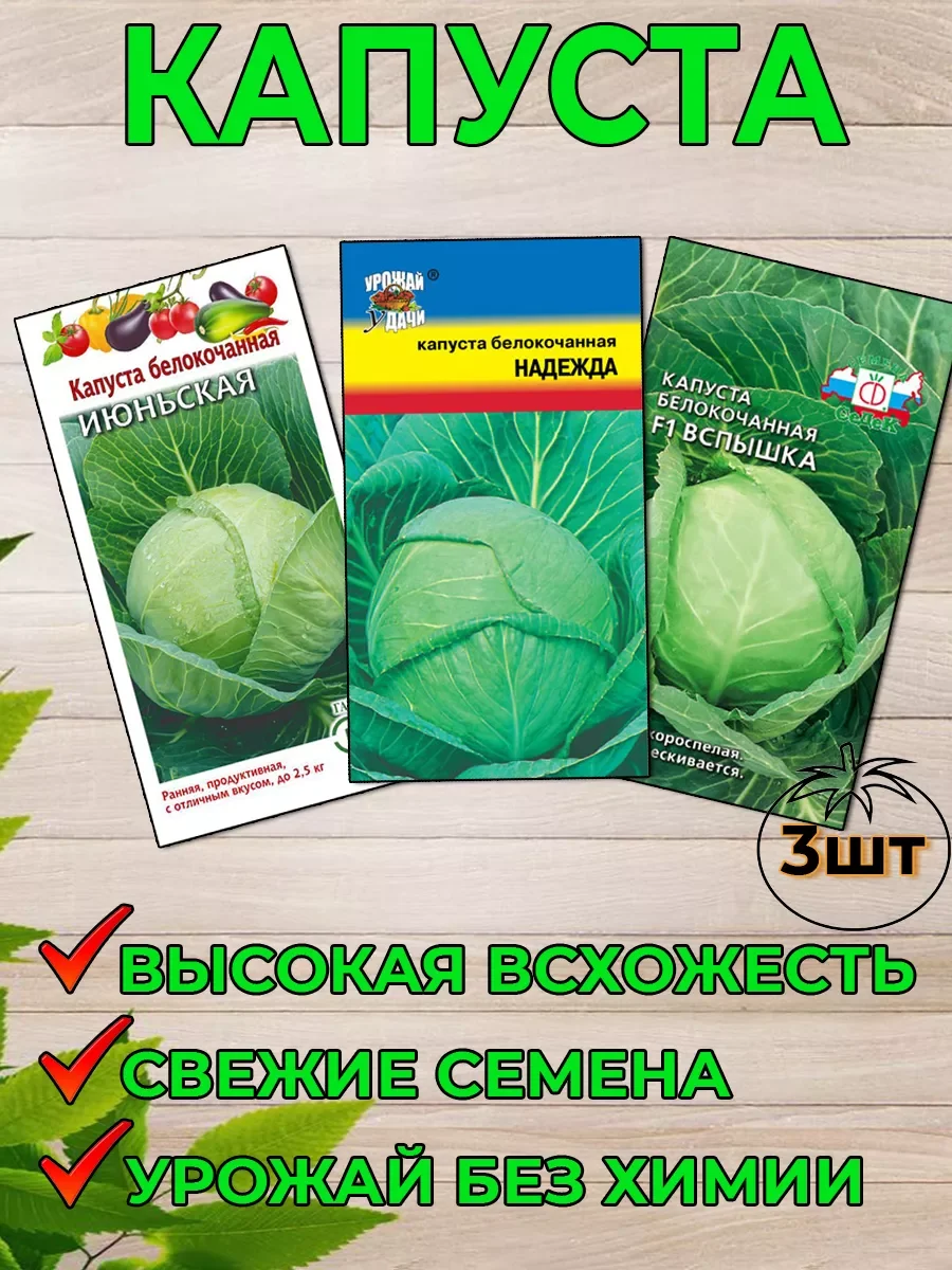 Набор состоит из трех пачек семян. КАПУСТА ИЮНЬСКАЯ: Раннеспелый (до 117 дней от всходов до технической спелости) сорт. Розетка листьев мелкая, компактная, диаметром 40-50 см. Кочан округлый, массой 0,9-2,5 кг, среднеплотный. Наружная окраска светло-зеленая, на разрезе бело-желтая. Вкусовые качества отличные. Сорт характеризуется высокой урожайностью, хорошими товарными качествами кочанов. Рекомендован для употребления в свежем виде. Урожайность 3,6-6,4 кг/м2.Посев на рассаду в конце марта - начале апреля. Пикировка - в фазе семядолей. Высадка в грунт - в конце апреля (под пленочные укрытия) – начале мая по схеме 30х50 см. Капуста белокочанная НАДЕЖДА Холодостойкий сорт. Среднеспелый. Период от всходов до уборки урожая 130-140 дней. Кочан округло-плоский, плотный, массой до 5 кг. Наружная окраска бледно-зеленая, на разрезе белая. Вкусовые качества отличные. Рекомендуется для потребления в свежем виде, квашения и хранения (до 3-х месяцев). Агротехника: Хорошие предшественники капусты - бобовые, огурец, картофель. Посев на рассаду проводят во второй половине марта. Всходы появляются через 5-7 дней. К высадке рассада готова через 35-40 дней после появления всходов, когда она имеет 4-5 настоящих листьев. Первую подкормку проводят в фазе двух настоящих листьев. Вторую - за несколько дней до высадки. В открытый грунт рассаду ранних сортов высаживают в конце апреля, поздних сортов - в конце мая. Посадка по схеме: ранняя капуста 60х40 см, среднепоздняя и поздняя - 60х60 см. КАПУСТА ВСПЫШКА: Ультраскороспелый (87-100 дней) гибрид с интенсивным формированием кочанов. Розетка листьев компактная. Кочаны округлые, плотные, массой 1,5-2 кг, внутренние листья сочные, сахаристые, очень вкусные. Урожайность 5,5-6,5 кг/м2. Ценность гибрида: устойчивость к фузариозу, пригодность для уплотненных посадок, выравненность кочанов, устойчивость к растрескиванию, отличные товарные качества. Рекомендуется для употребления в свежем виде в различных салатах.