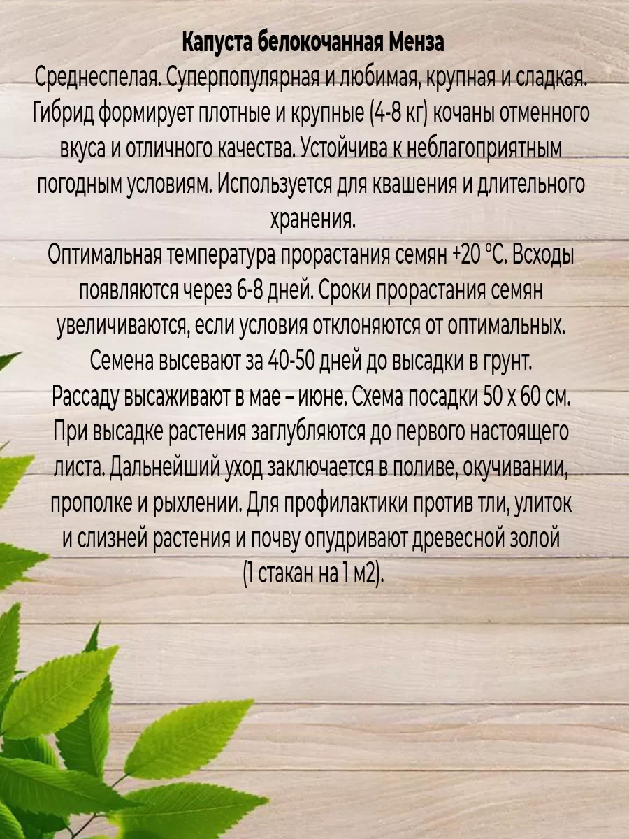 КАПУСТА Менза: Самый крупнокочанный гибрид капусты весом 5 — 9 кг. Среднеранний. Предназначен для потребления в свежем виде, переработки и хранения (до 4 месяцев). Созревает через 110 дней после пересадки. Кочаны округло-плоские. Рекомендуется для выращивания в летне-осенний период.