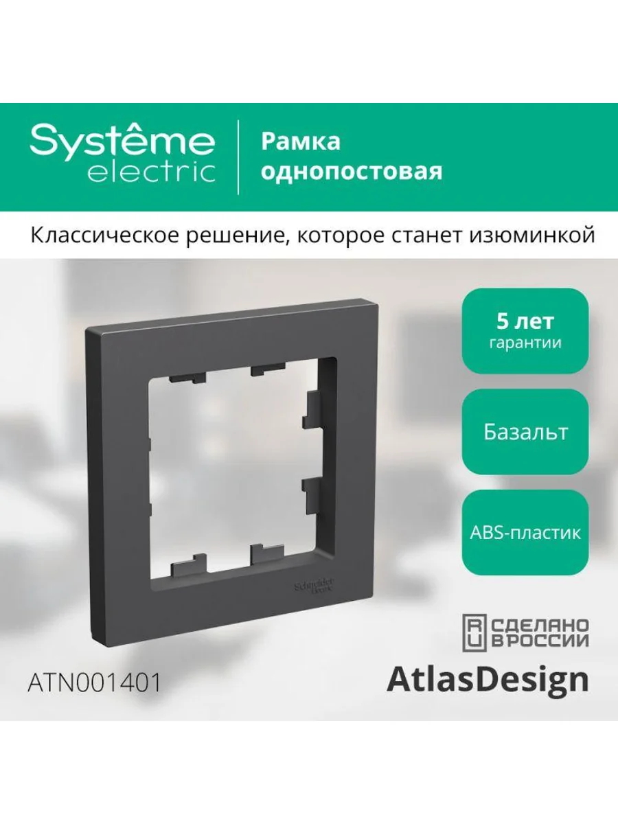 Рамка Systeme Electric (ранее Schneider Electric) серии AtlasDesign в цвете БАЗАЛЬТ одинарная. - Лицевые детали из качественного ABS-пластика, устойчивого к царапинам и УФ-излучению. - Позволяет гармонично вписать электроустановочное изделие в интерьер помещения.