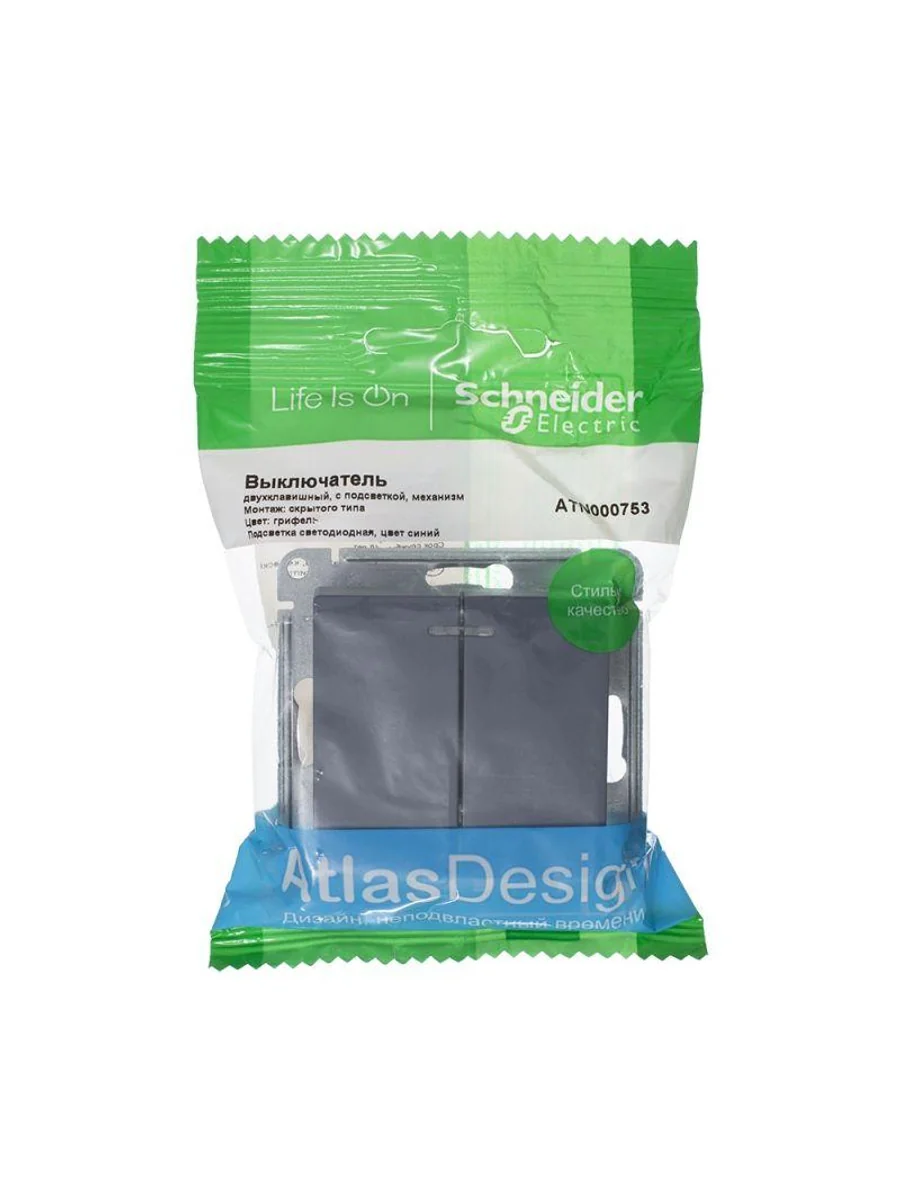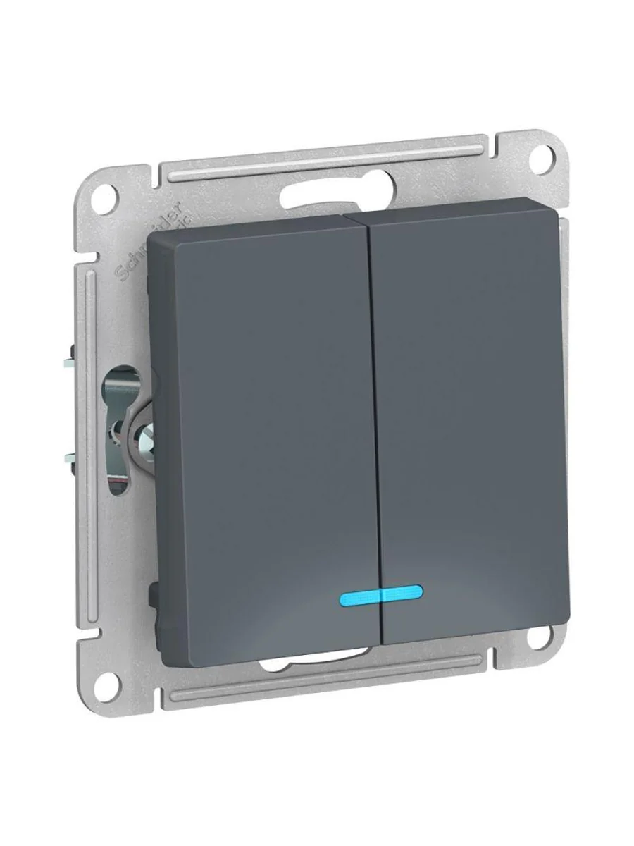 Механизм Systeme Electric (ранее Schneider Electric) серии AtlasDesign в цвете грифель выключателя 2-клавишного c подсветкой подходит для сетей 250 В, на ток 10 А. Благодаря светодиодной подсветке синего цвета изделие легко найти в темноте. Двухклавишный выключатель позволяет управлять двумя источниками света с одной точки. Лицевые детали из качественного ABS-пластика, устойчивого к царапинам и УФ-излучению.