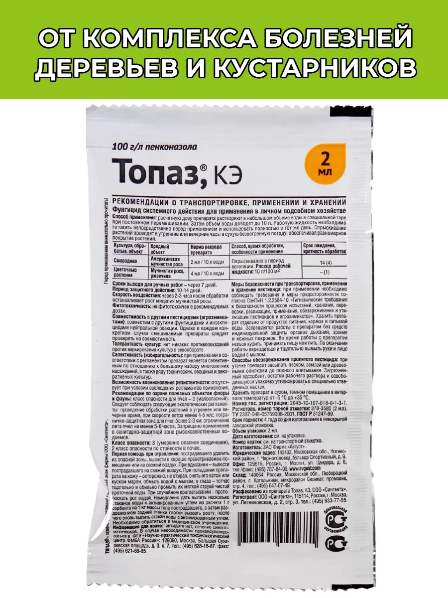 Препарат Топаз, КЭ - фунгицид для защиты смородины и цветочных растений от американской мучнистой росы, мучнистой росы и ржавчины. Обладает профилактическим, лечебным и искореняющим действиями. Останавливает рост мицелия возбудителя мучнистой росы через 2-3 часа после обработки. Быстро поглощается растениями, что снижает риск смывания дождем. Производитель упаковки: АО Фирма «Август», Россия. Производитель содержимого: Сингента Кроп Протекшн. Заводская фасовка: ампула 2 мл. Препаративная форма: КЭ - концентрат эмульсии. Срок годности: 4 года. Действующее вещество: 100 г/л пенконазола. Норма расхода препарата: 2-4 мл на 10 литров. Расход рабочей жидкости: 10л на 100 м². Возможно приобретение упаковки 10 мл, 1 литр.