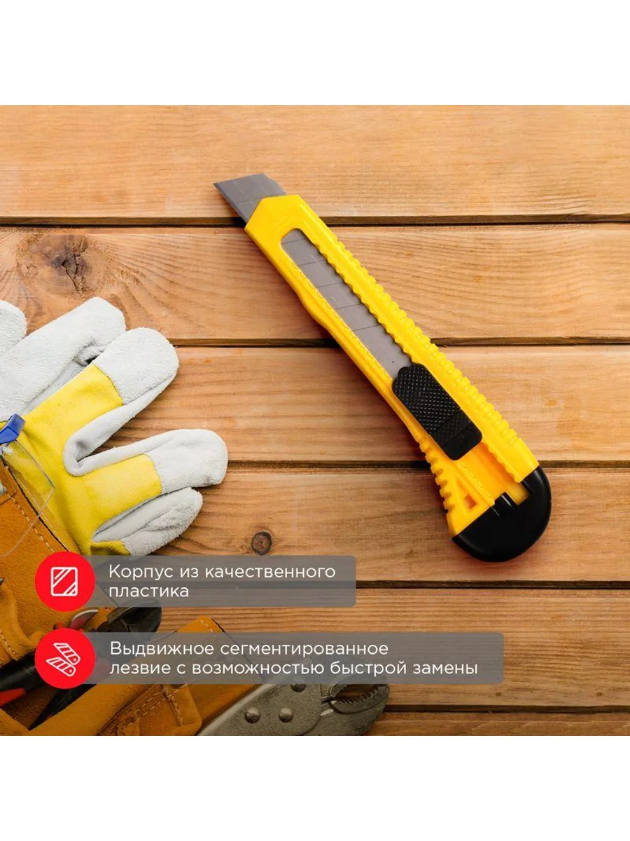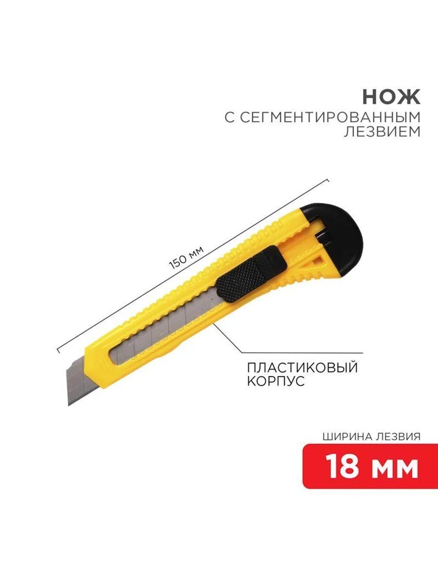 Нож REXANT с выдвижным сегментированным отламывающимся лезвием — отличный помощник для разрезания различных материалов: пластика, картона, бумаги. Корпус ножа выполнен из пластика. Сегментированное лезвие шириной 18 мм изготовлено из высококачественной инструментальной стали. Когда крайний сегмент затупляется, его можно отломить и продолжить использование инструмента. Замена лезвия быстро и просто осуществляется вручную через хвостовую часть ножа.