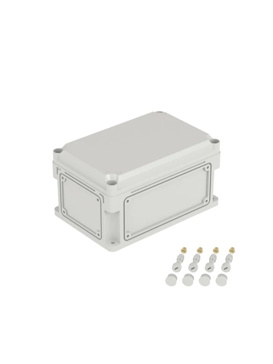 Ударопрочные корпуса "RAM box" предназначены для систем автоматизации и распределения электроэнергии, эксплуатирующихся в жестких условиях. Корпус и непрозрачная крышка изготавливаются из поликарбоната, категория стойкости к горению ПВ-0 (V-0), цвет RAL 7035. Степень защиты IP66/IP67 обеспечивает оборудованию, установленному внутри корпуса, двойную защиту от воздействия струй воды и от временного полного погружения в воду. Степень защиты от механического удара IK09 при температуре - 50° C. Климатическое исполнение УХЛ1, корпус устойчив к воздействию УФ-излучения. Комплект поставки: корпус с 2 фланцами типа B и 2 фланцами типа C, крышка высотой 35 мм, пластиковые винты для крепления крышки к корпусу, забивные втулки M6 для монтажа оборудования. Габариты 200x300x160 (ВхШхГ) мм.