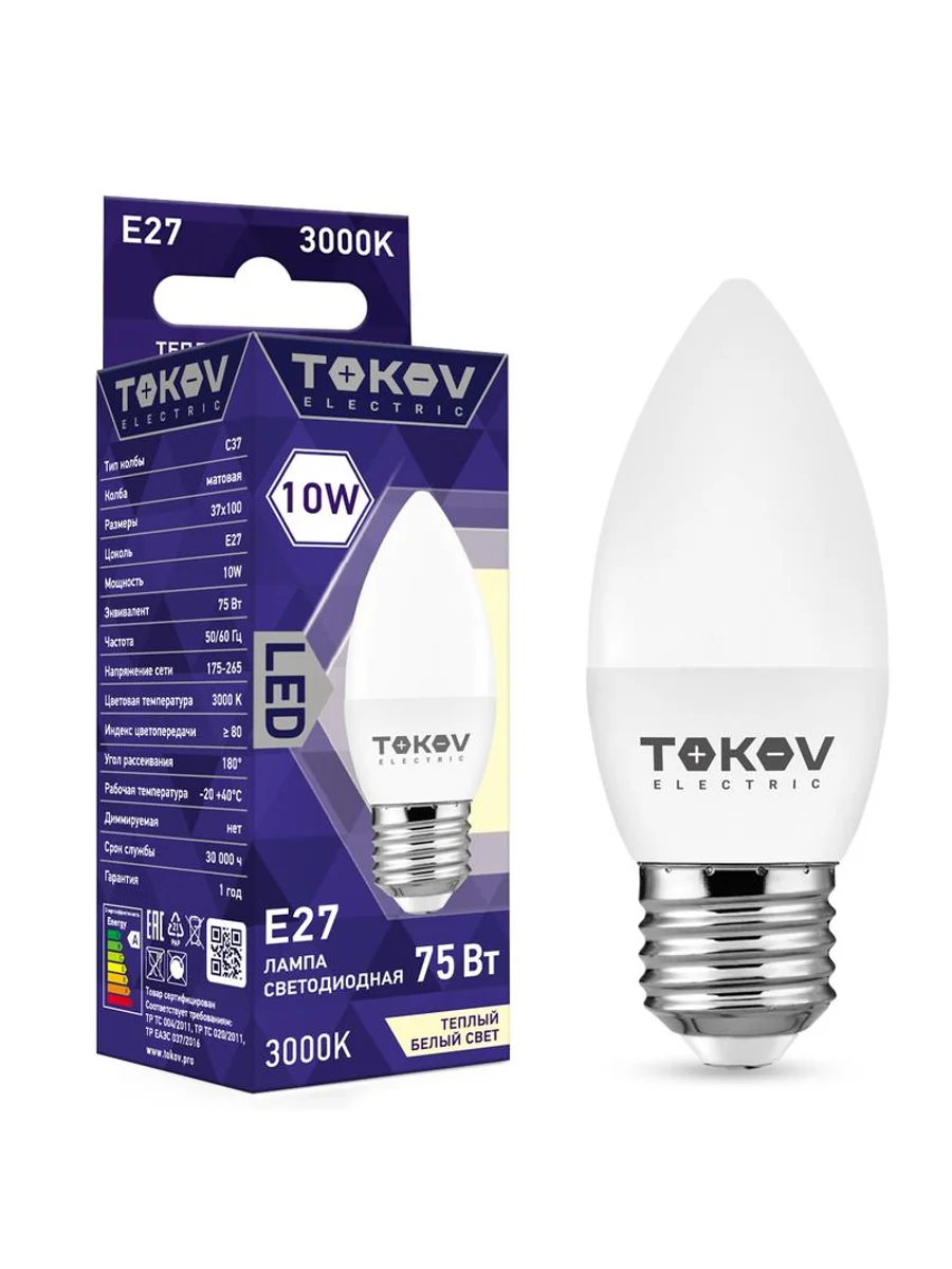 Лампа светодиодная 10Вт С37 3000К Е27 176-264В TOKOV ELECTRIC TKE-C37-E27-10-3K - купить в KeepBuilding | KeepBuilding
