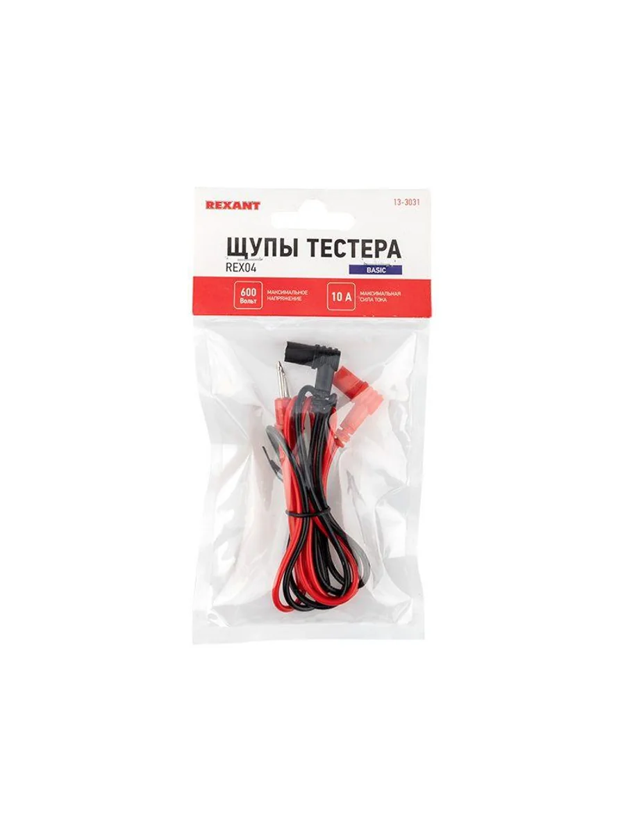 Щупы REX04 REXANT для тестера и токовых клещей. Они подсоединяются к гнездам мультиметра, для удобства имеют разные цвета: черный и красный. Как правило, черный щуп подключается на общее гнездо, а красный — на гнездо «+». Клеммы, провода и ручки щупов надежно изолированы для защиты пользователя от поражения электрическим током. Для удобства работы металлические концы щупов заострены. Класс защиты от перенапряжения: Категория 1 до 600 В 10 А Длина: 720 мм Длина рукояти от защитной гарды: 63 мм Длина жала: 15 мм Длина штекера: 10 мм Диаметр штекера: 8 мм Угол штекера: 90 градусов (прямой) Подходят для недорогих приборов с коротким посадочным гнездом, серий MASTECH, PROconnect, 830, 832, 838 и т. п.