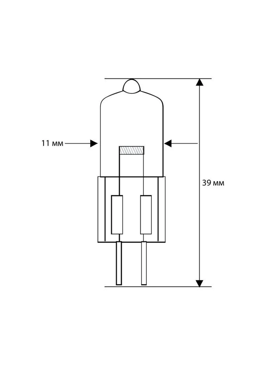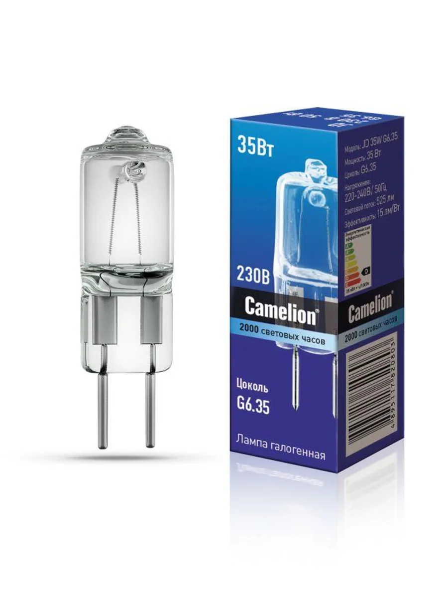 Лампа галогенная JD 220В 35Вт капс. G6.35 Camelion 5203 – низковольтная лампа без отражателя, с прозрачной колбой, длиной 42 мм, с цоколем G6.35, мощностью 35 Вт. Цветовая температура 2850 К.