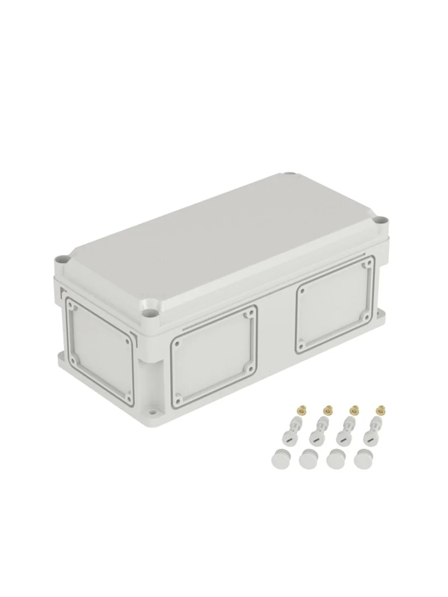 Ударопрочные корпуса "RAM box" предназначены для систем автоматизации и распределения электроэнергии, эксплуатирующихся в жестких условиях. Корпус и непрозрачная крышка изготавливаются из поликарбоната, категория стойкости к горению ПВ-0 (V-0), цвет RAL 7035. Степень защиты IP66/IP67 обеспечивает оборудованию, установленному внутри корпуса, двойную защиту от воздействия струй воды и от временного полного погружения в воду. Степень защиты от механического удара IK09 при температуре - 50° C. Климатическое исполнение УХЛ1, корпус устойчив к воздействию УФ-излучения. Комплект поставки: корпус с 6 фланцами типа B, крышка высотой 35 мм, пластиковые винты для крепления крышки к корпусу, забивные втулки M6 для монтажа оборудования. Габариты 200x400x160 (ВхШхГ) мм.