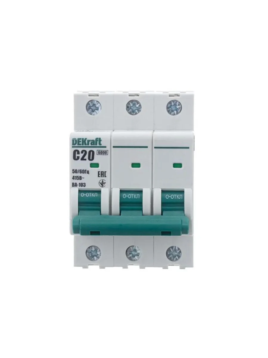 Автоматический выключатель серии ВА-103 NEW Dekraft; 3P; номинальный ток 20 А; характеристика C; отключающая способность 6 кА, что позволяет использовать аппараты в качестве вводных. 5 монолитных заклепок повышают прочность корпуса аппарата. Окошко-индикатор всегда показывает состояние контактов вне зависимости от положения рукоятки управления. Боковые каналы охлаждения повышают стабильность работы при высоких температурах окружающей среды. Есть возможность установки дополнительных аксессуаров с левой стороны устройства. Аппарат на 100% совместим с корпусами и оболочками Dekraft, Systeme Electric.