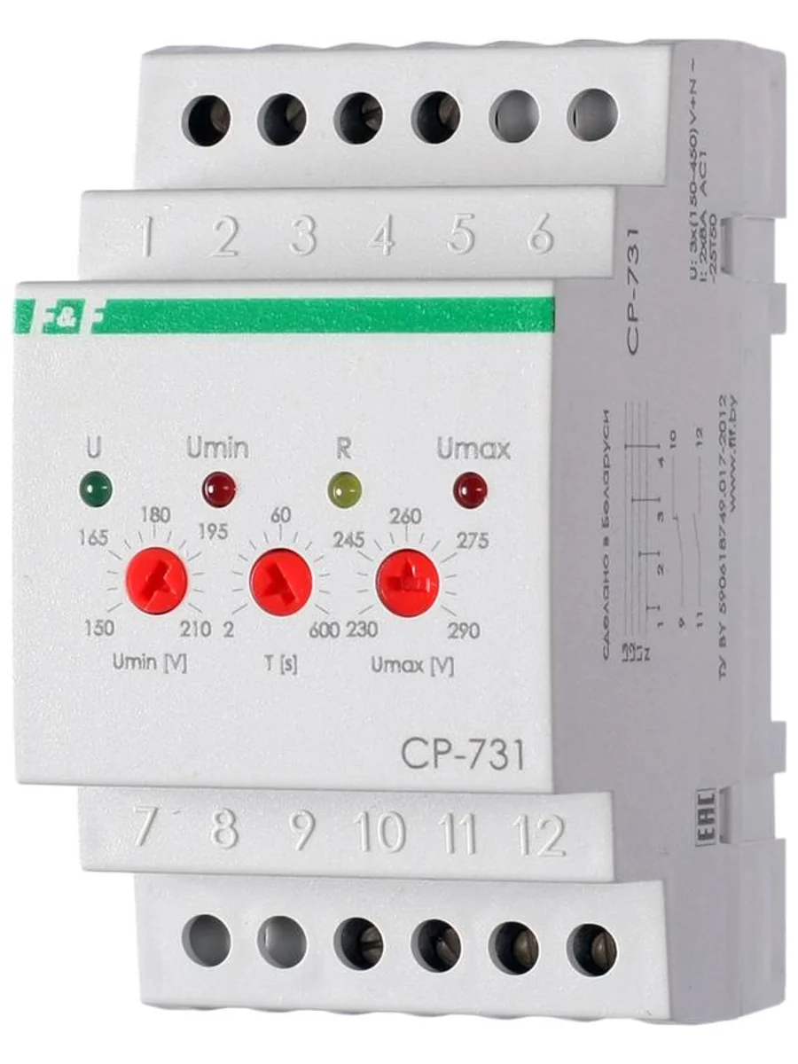 Реле напряжения серии "CP" Монтаж на DIN-рейку. Предназначено для непрерывного контроля величины напряжения в трехфазной сети переменного тока и защиты электроустановок, электроприборов и прочего электронного оборудования от повышенного или пониженного напряжения, от обрыва нулевого провода. Защита осуществляется путем отключения нагрузки от сети питания. Верхний и нижний пределы напряжения устанавливает потребитель с помощью потенциометров на панели управления. Реле измеряет напряжение в сети и при выходе напряжения за установленные пределы или обрыве нулевого провода реле отключает защищаемое оборудование. После восстановления сетевого напряжения реле включается автоматически. Особенности реле напряжения CP-731: трехфазное; контроль асимметрии напряжения; контроль слипания фаз; контроль чередования фаз; напряжение питания - 3х(150...450)+N В AC; максимальный ток нагрузки - 2х8 А; контакты - 1NO, 1NC; нижний порог напряжений - 150...210 верхний порог напряжений - 230...190