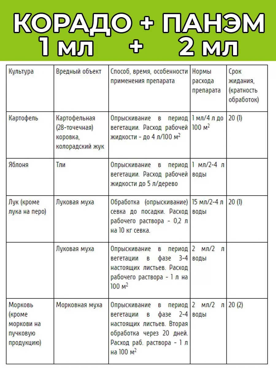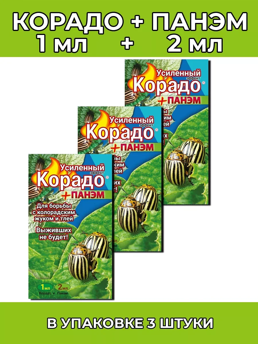 Системный препарат – защищает даже молодой прирост, растущий после опрыскивания. Эффективен и против личинок, и против взрослых жуков. Усиленный эффект достигается благодаря специальному прилипателю «Панэм». Более прочный контакт с листьями и покровами вредителей, большее и лучшее проникновение действующего вещества в организм насекомых и листовые пластины, меньше потерь препарата из-за стекания с листьев и испарения в жаркую погоду. После опрыскивания защищает картофель и другие культуры длительное время, в том числе за счёт меньшего смывания дождём и росой. Применение: Приготовление рабочего раствора Корадо + Панэм: налить в ведро 1 л воды, вскрыть ампулу, отмерить нужное количество препарата «Корадо» (согласно норме расхода из таблицы), вылить в ведро и тщательно перемешать. Затем добавить необходимое количество препарата «Панэм» (исходя из нормы расхода 2 мл на 4 л воды), снова тщательно перемешать. Раствор сильно пенится – учитывайте это при выборе тары для разведения. Далее добавить воды до нужного объёма и ещё раз перемешать. Опрыскивать растения свежеприготовленным раствором Корадо + Панэм в сухую, безветренную погоду, желательно утром (до 10 часов) или вечером (18-22 часа), равномерно смачивая листья, не менее чем за 4-6 часов до дождя. Оптимальная температура при обработках от +12..+25 °С. Избегать попадания раствора на соседние культуры.