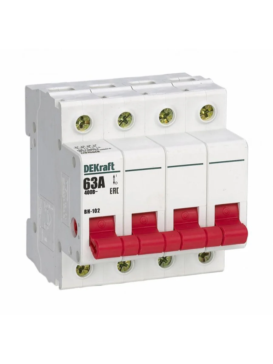 Выключатель-разъединитель серии ВН-102 Dekraft; 4P; номинальный ток 63 А; установка – на DIN-рейку; установочное положение - любое. Выключатели-разъединители применяются для ручного включения/отключения сетей напряжением до 400 В. Специальные мостиковые контакты обеспечивают надежный разрыв цепи; они полностью исключают возможность перекрытия дугой по изоляции. Усиленная рукоятка управления обеспечивает большое количество включений/отключений.