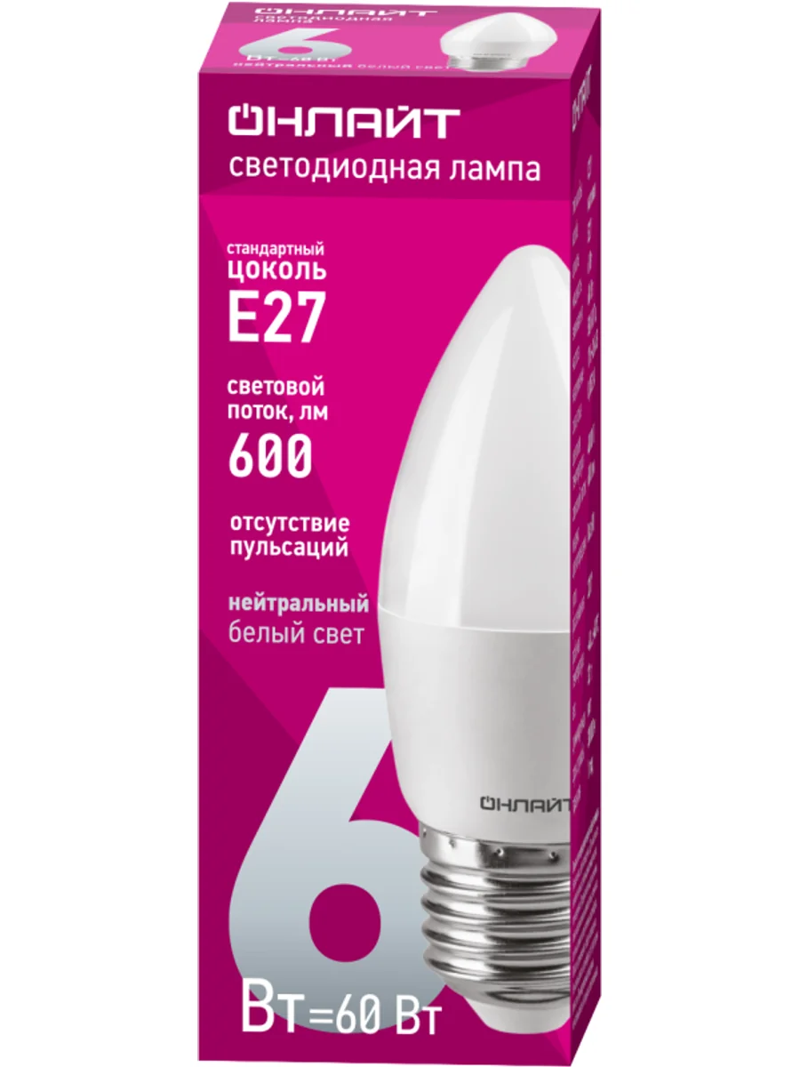 Лампа светодиодная 71 631 OLL-C37-6-230-4K-E27-FR ОНЛАЙТ 4670004716311 – лампа с колбой типа "свеча", длиной 104 мм, с цоколем Е27, мощностью 6 Вт. Цветовая температура 4000 К. Дает нейтральный белый свет. По итогам проведенных независимых испытаний светодиодная лампа ТМ Онлайт максимально нагревается в колбе – 38,2С, в корпусе – 82,5С. Что подтверждает стандартный температурный режим для длительной работы светодиодов.