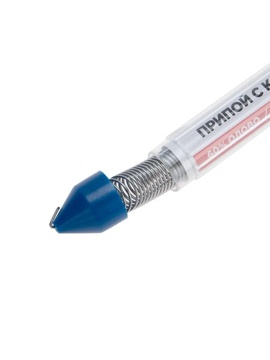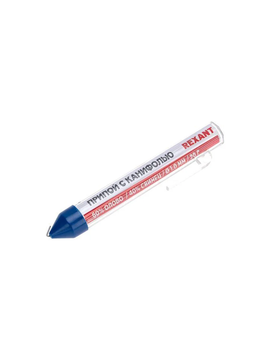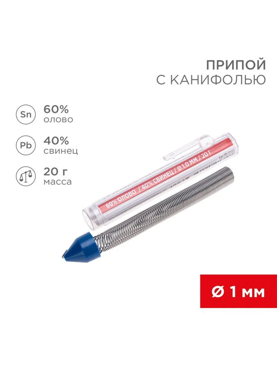 Припой с канифолью REXANT представляет собой проволоку из сплава олова и свинца. Упакован в колбу-карандаш с клипсой на корпусе. Используется в пайке для соединения деталей между собой и позволяет создать герметичный, механически прочный шов. Нагреваясь до температуры плавления, припой растекается по спаиваемому металлу и заполняет полости между соединяемыми элементами. Активный канифольный флюс в составе дополнительно усиливает прочность шва. Убирает окислительную пленку со спаиваемых поверхностей и предупреждает ее дальнейшее появление. Колба позволяет организовать дозированную подачу припоя и исключает формирование остатков. Характеристики: Длина: 3,3 м (±3%) Диаметр: 1 мм Состав: сплав олова 60% и свинца 40% Содержание канифольного флюса МС-20А в припое: 2,2% Температура плавления: 183...188 °C Вес: 20 г Преимущества: Наличие канифольного флюса в припое Экономичный расход, удобная упаковка Невысокая температура плавления