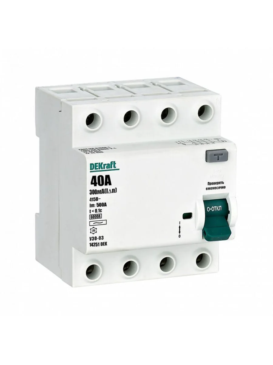 Выключатель дифференциального тока серии УЗО-03 Dekraft; 4P; номинальный ток 40 А; ном.дифф. ток 300 мА; электромеханический; тип дифференциального расцепителя - AC; на DIN-рейку. ВДТ устанавливаются в сетях напряжением до 400 В пер.тока. ВДТ применяются для защиты электроустановок от риска возникновения пожаров вследствие утечек тока. Конструкция устройств позволяет эксплуатировать их даже при низкой температуре. При сборке выключатель дифференциального тока (ВДТ) и автоматический выключатель (для защиты ВДТ) устанавливаются последовательно, при этом номинальный ток аппарата должен быть на одну ступень выше — т. е. 20А при установке последовательно с автоматом на 16А, 32А при установке с автоматом на 25А.
