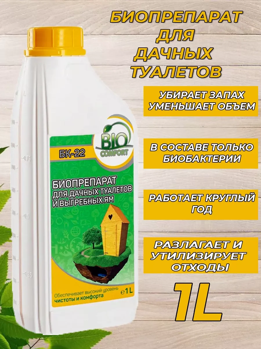 Биопрепарат для дачных туалетов и выгребных ям БК 22 1 л Биосептик БК-22 высококонцентрированный симбиоз микроорганизмов и биологически активных ферментов с преобладанием аэробных бактерий, предназначен для разложения и утилизации отходов и продуктов жизнедеятельности человека в дачных туалетах и выгребных ямах.