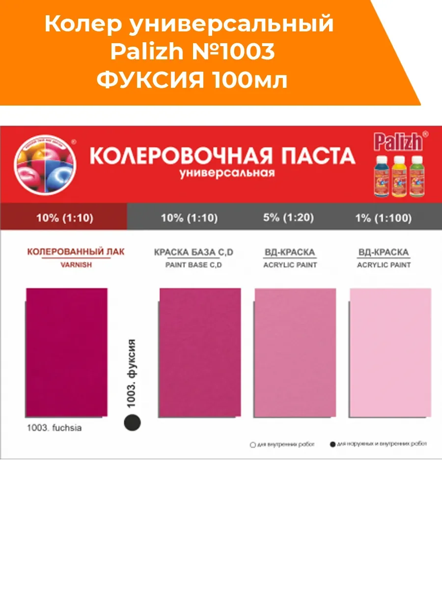 Универсальная колеровочная паста "Palizh" STANDART предназначена для колерования воднодисперсионных, алкидных (ПФ) лакокрасочных материалов: краски, лаки, эмали, шпатлевки, затирки, пропитки, грунтовки, штукатурки, гипсовые смеси. Не применять для колерования составов, содержащих масла и воски. Насыщенность цвета можно регулировать в процессе смешивания. Колеровка не изменяет первоначальных свойств краски (при соблюдении рекомендованного процента ввода) .Инструмент легко очищается водой. Не использовать как самостоятельный продукт. Для получения ярких оттенков используйте краски, эмали с обозначением База С ( D) или лаки. Храните в сухом помещении при температуре от +5 до + 30°С. Срок годности в невскрытой таре производителя - 36 мес. Допускается замораживание при транспортировке сроком не более 1 мес. Выдерживает 5 циклов заморозки/разморозки, после оттаивания и тщательного перемешивания сохраняет свои свойства. Совместимость ПФ-эмали, грунты, затирки для швов, краски акриловые (ВД), лаки акриловые (ВД), пропитки для дерева акриловые (ВД), шпатлевки акриловые/латексные (ВД), штукатурки декоративные/ Применение: 1. Пасту перемешать; 2. Ввести пасту в небольшой объём колеруемого материала; 3. Перемешать; 4. Смесь перемешать со всем объемом колеруемого материала *вводить не более 5% возможно добавление до 10% по рекомендации производителя колеруемого материала *не использовать как самостоятельное покрытие *не использовать для воска и масел *перед применением рекомендовано предварительное тестирование.