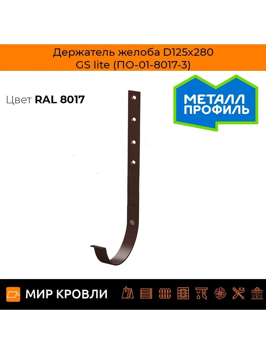 Водосточная система необходима для устранения воды с кровли, Держатель желоба МЕТАЛЛ ПРОФИЛЬ GS lite D125х280 Ral 8017 — её обязательный элемент. Основа из оцинкованной стали обеспечивает прочность; круглая водосточная система не корродирует и великолепно выдерживает механические повреждения. Обработка защитным слоем Порошковая окраска положительно влияет на срок службы и усиливает и защитные качества Держатель желоба МЕТАЛЛ ПРОФИЛЬ GS lite D125х280 Ral 8017. Водосток 8017 Коричневый шоколад украсит любые здания, вне зависимости от их стиля.