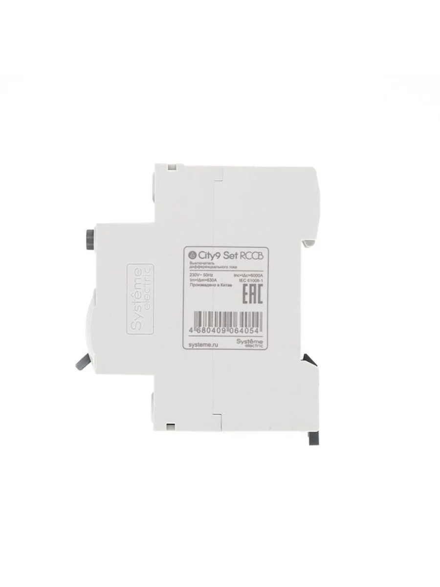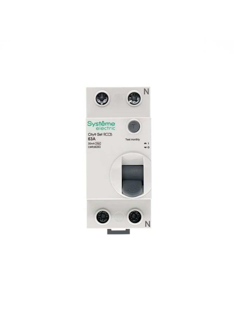 Выключатель дифференциального тока (ВДТ) или устройство защитного отключения (УЗО) серии City9 Set Systeme Electric, 2-полюсный, номинальный ток 63А, ток утечки 30 мА, тип АС, электромеханический. Применяется в электрических сетях напряжением 230В. Уставка по току утечки 30 мА обеспечивает гарантированную защиту людей при прямом и косвенном прикосновении. Кнопка тест обеспечивает проверку работоспособности аппарата. Крепление на DIN-рейку шириной 35 мм. Подключение сверху и снизу. Безопасные клеммы (ранее Schneider Electric EZ9R34263).