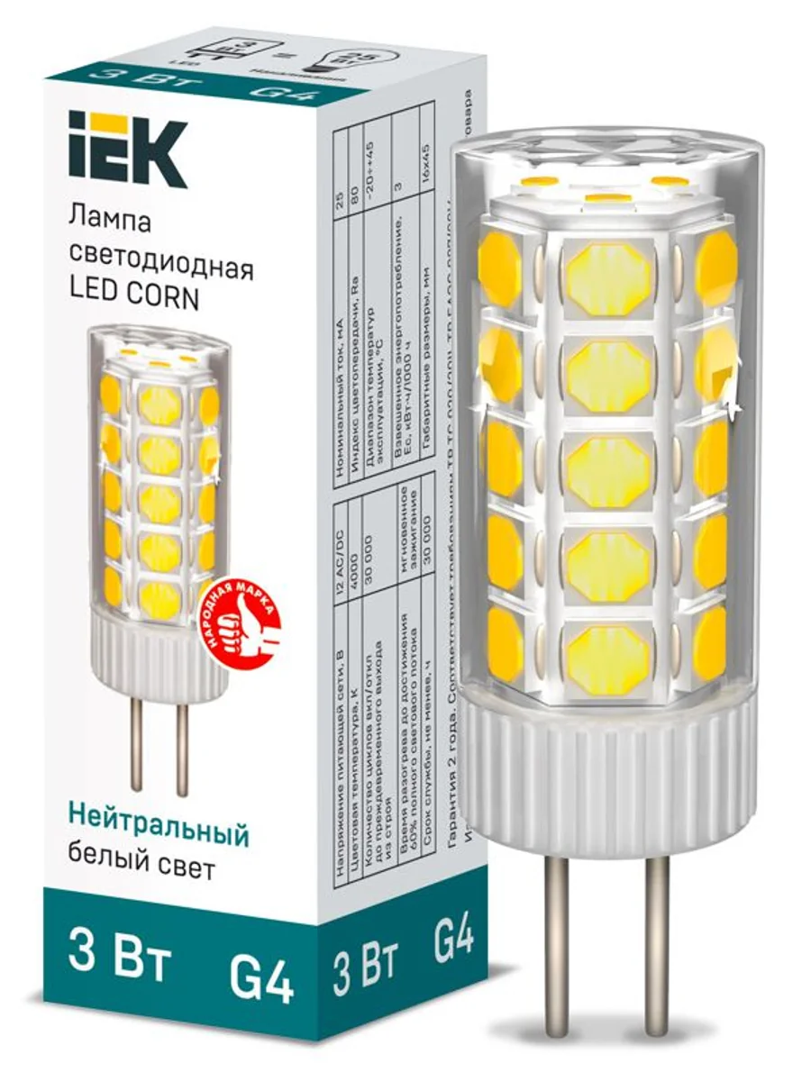 Светодиодная капсульная лампа LED CORN капсула 3Вт 12В 4000К керамика G4 IEK является заменой капсульных галогенных ламп соответствующего цоколя и используются как для основного освещения жилых и коммерческих помещений, так и для точечной и акцентной подсветки.