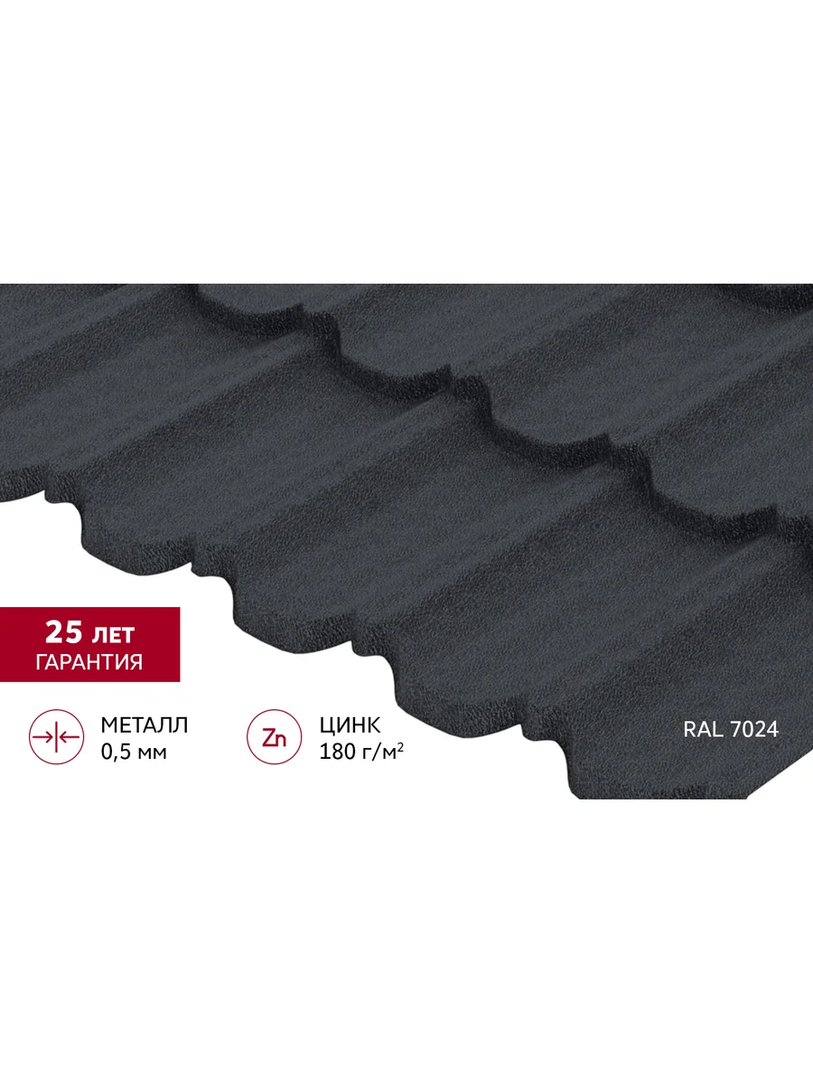 Металлочерепица «Квинта плюс3D» от бренда GrandLine — это современное и практичное решение для кровли вашего дома. Она отличается высокой прочностью и долговечностью благодаря толщине металла в 0,5 мм и качественному покрытию Satin Matt TX. Цвет RAL 7024 (мокрый асфальт) придаёт кровле элегантный и стильный вид, который гармонично сочетается с любым архитектурным стилем.