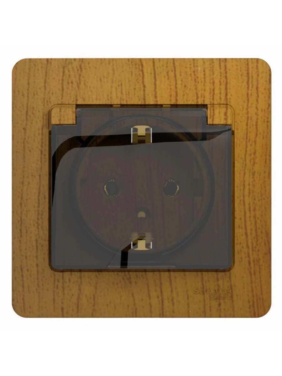 Розетка Systeme Electric (ранее Schneider Electric) серии Glossa (в сборе, цвет дерево дуб) одинарная с заземлением, шторками и крышкой подходит для сетей 250 В, на ток 16 А. - Заземляющий контакт обеспечивает дополнительную защиту от удара электрическим током. При наличии заземления электрический потенциал уходит в землю, защищая человека. - Выполнен из материала PС+ASA, стойкого к УФ-излучению и появлению царапин. - Эргономичные клеммы розеток расположены в один ряд.