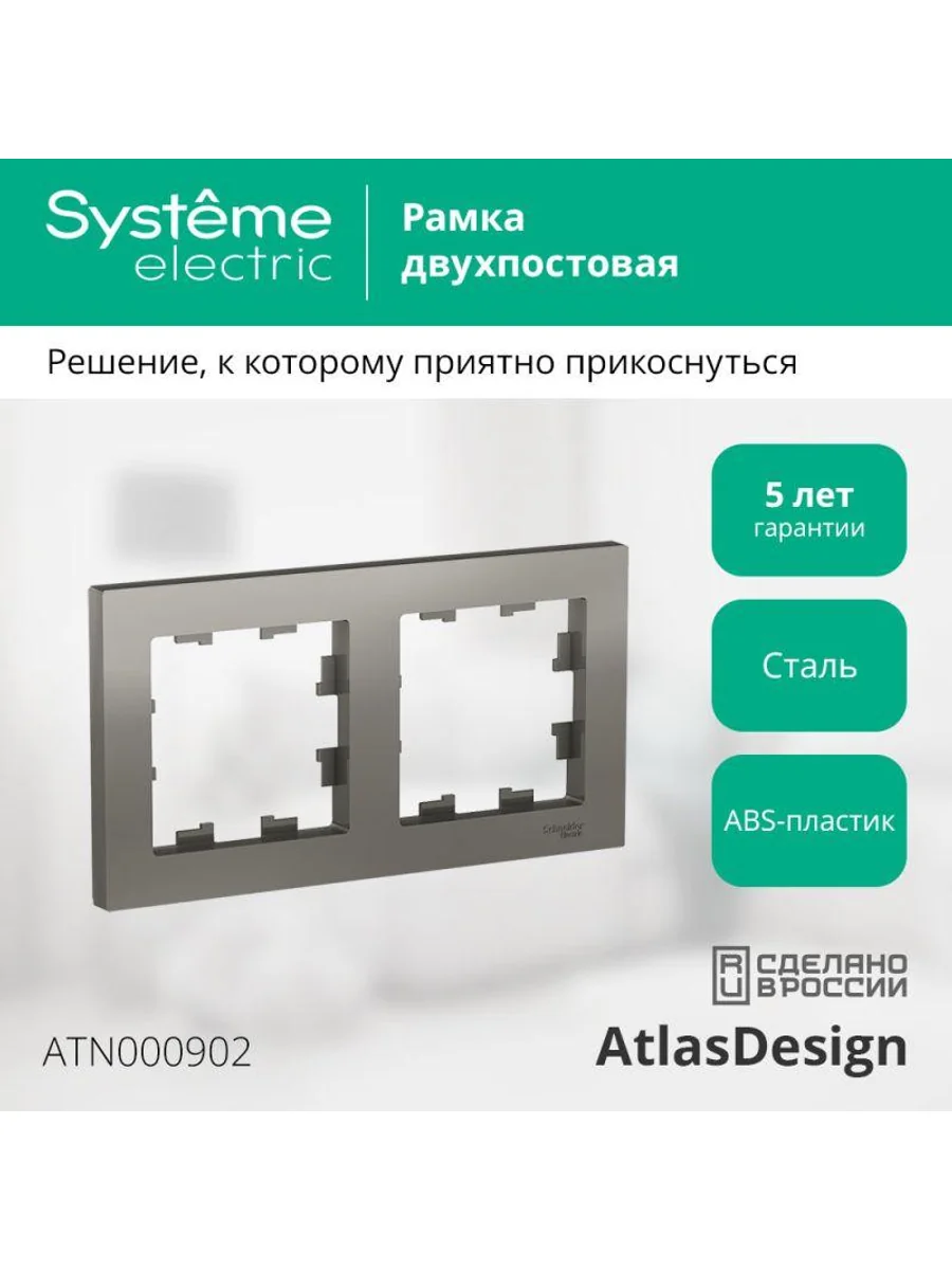 Рамка Systeme Electric (ранее Schneider Electric) серии AtlasDesign в цвете сталь двухместная. - Устанавливается в вертикальном и горизонтальном положениях. - Лицевые детали из качественного ABS-пластика, устойчивого к царапинам и УФ-излучению. - Позволяет гармонично вписать электроустановочное изделие в интерьер помещения.