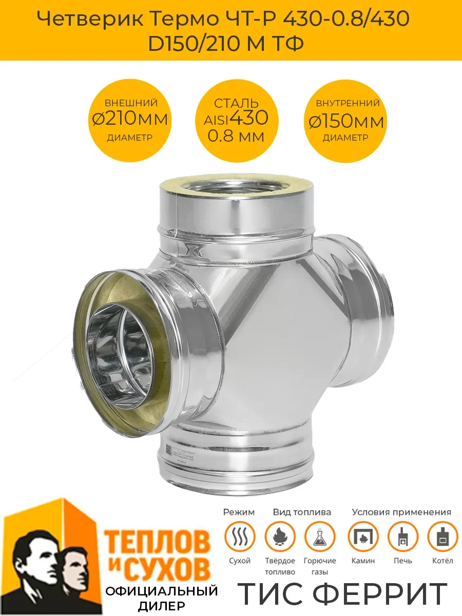 Четверик Термо утепленный предназначен для изменения направления дымового канала на 87* и обслуживания дымохода - ревизии, чистки, отвода конденсата. Благодаря особенностям конструкции и применяемой технологии производства, четверик обладает повышенной газоплотностью, в дымовом канале отсутствуют прямые углы на пути следования исходящих дымовых газов, что способствует улучшенной тяге дымохода.