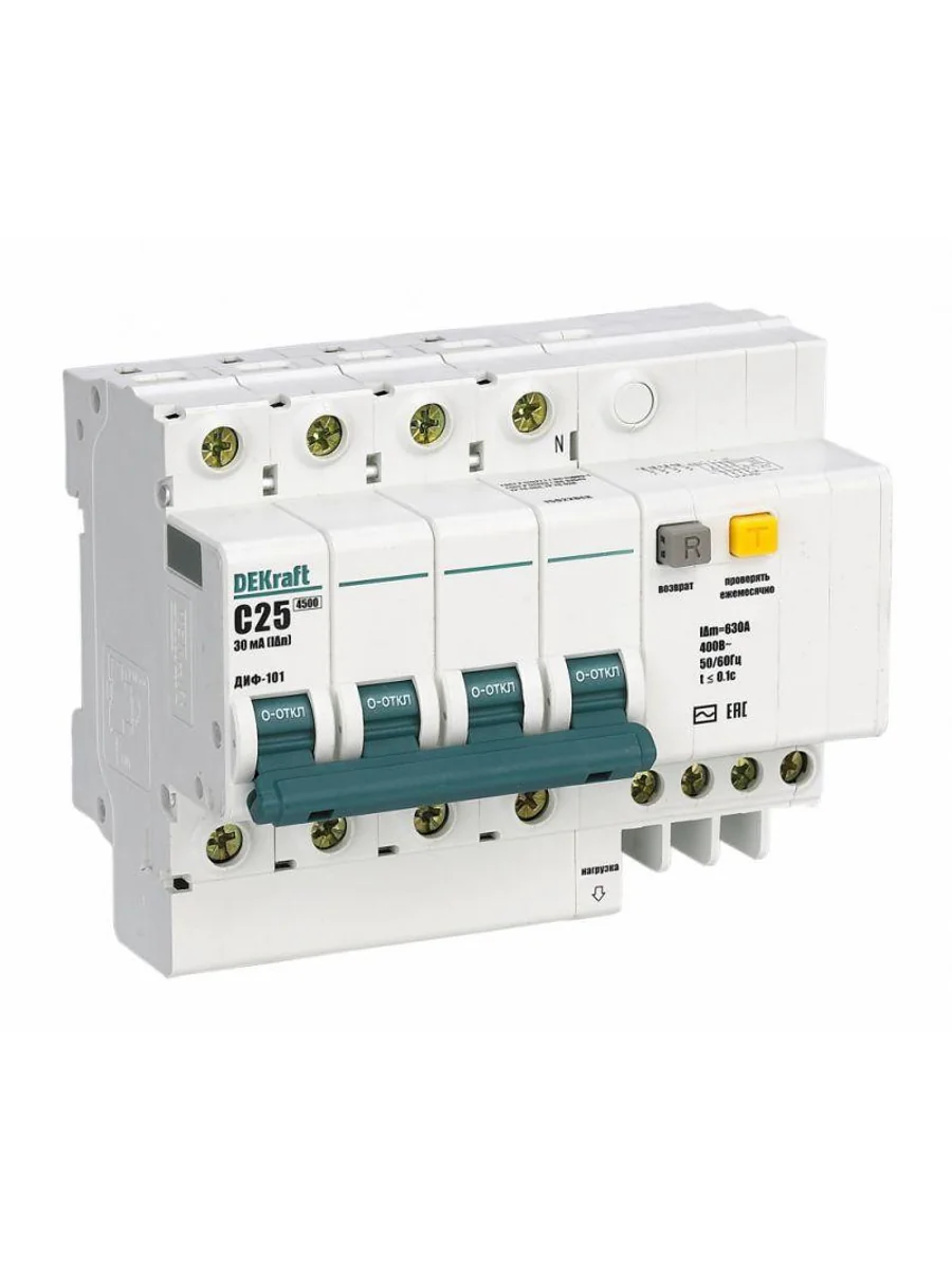 Автоматический выключатель дифференциального тока серии ДИФ-101 Dekraft; 4P; ном.ток 40 А; характеристика C; откл.способность Icn = 4,5 kA; ток утечки 30 мА; блок дифф.защиты – электронный; ширина – 8 мод. х 18 мм; монтаж – на DIN-рейку. АВДТ серии ДИФ-101 применяются в сетях напряжением до 400 В пер.тока для защиты человека от поражения электрическим током и электроустановок от сверхтоков и токов утечки. Для расширения функционала АВДТ возможно использование аксессуаров от выключателей серии ВА-101.