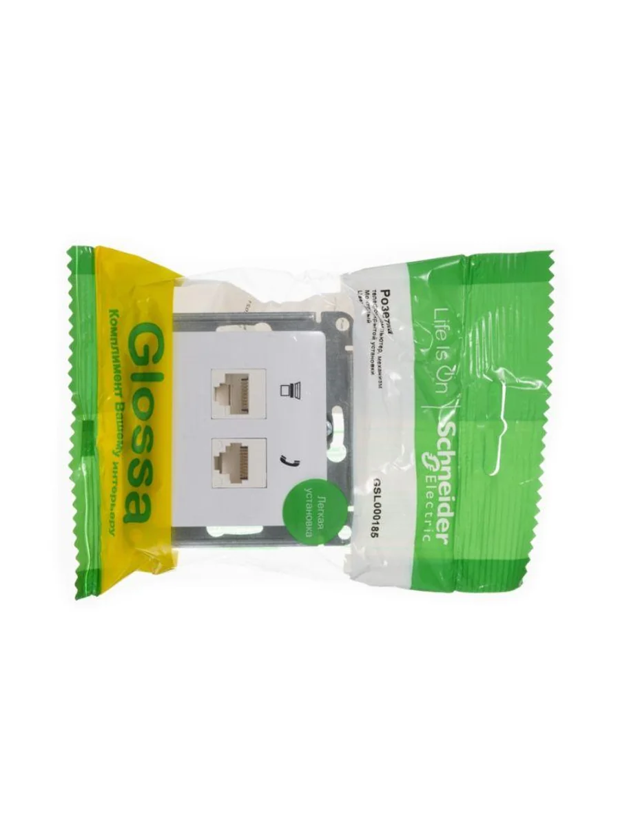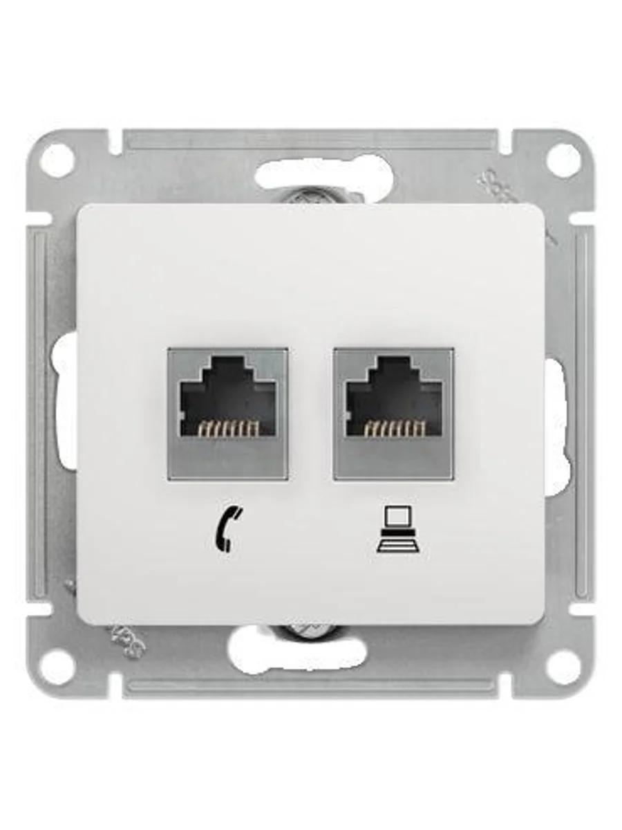 Механизм Systeme Electric (ранее Schneider Electric) серии Glossa (цвет белый) двойной розетки разъёмами RJ45 категория 5е и RJ11 предназначен для удобного и быстрого подключения вашего компьютера и телефона к соответствующим сетям. - Выполнен из материала PС+ASA, стойкого к УФ-излучению и появлению царапин.
