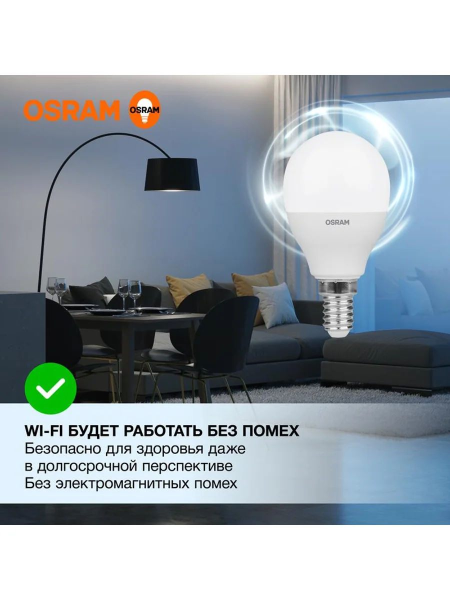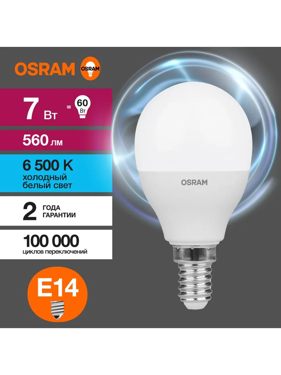 Светодиодные лампы OSRAM - разумная замена традиционным лампам накаливания или галогенным лампам. Светодиодные лампы OSRAM снижают затраты на освещение до 90% при сохранении привычного уровня освещенности. Эта лампа OSRAM серии LED Value выполнена в форме колбы P ("шарик") с цоколем E14. Материал колбы - пластик, исполнение - матовое. Световой поток 560 люмен, что соответствует лампе накаливания на 60 Вт. Такие лампы применяются для внутреннего освещения, хотя в закрытом светильнике можно использовать и на улице. Эта лампа излучает холодный белый свет, угол пучка - широкий. Качество света на высоте: низкие пульсации защищают глаза, а высокий индекс цветопередачи позволяет видеть мир в его истинном цвете. Кроме того, лампы OSRAM полностью безопасны для здоровья, поскольку в них нет опасных материалов по европейскому стандарту RoHS, а также они не производят вредных электромагнитных излучений, что подтверждено ЭМС (сертификат электромагнитной совместимости). Лампа проработает долго: срок службы - 25000 часов, 2 года гарантии. Светодиодные лампы OSRAM - умный выбор для здоровья семьи и кошелька!